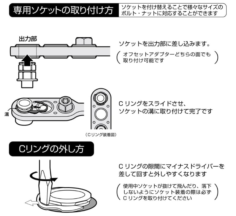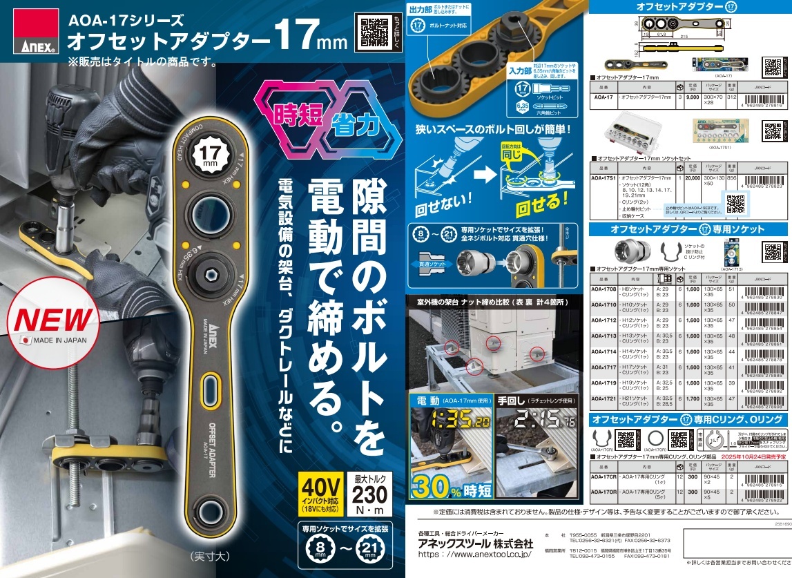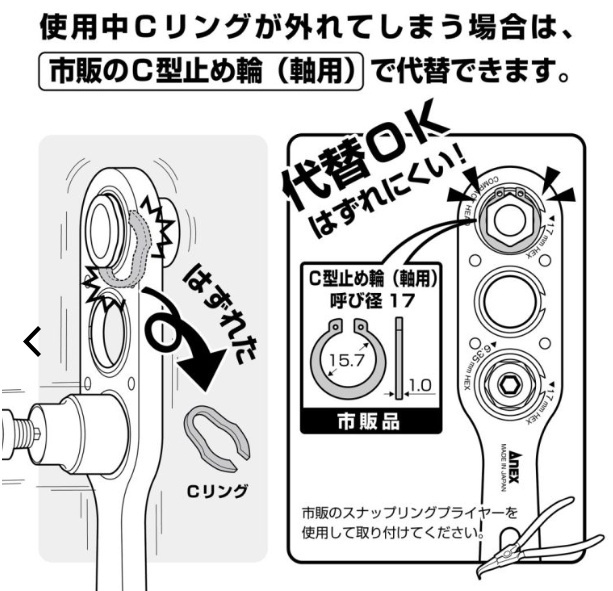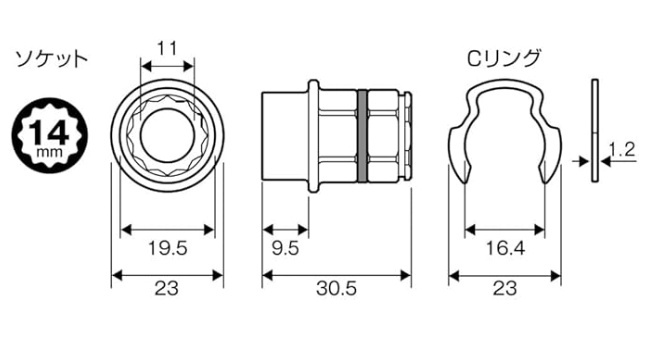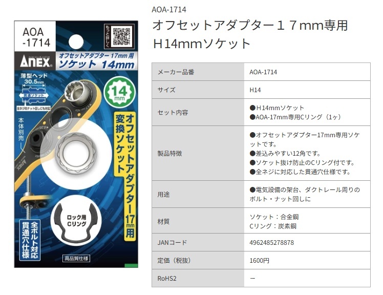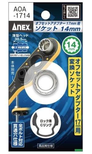 アネックス(ANEX) オフセットアダプター17mm専用H14mmソケット AOA-1714■製品特徴・オフセットアダプター17mm専用ソケットです。・差込みやすい12角です。・ソケット抜け防止のCリング付です。・全ネジに対応した貫通穴仕様です。■用途電気設備の架台、ダクトレール、単管パイプ周りのボルト回しに■セット内容・H14mmソケット・AOA-17mm専用Cリング(1ヶ)■仕様・ソケット材質:合金鋼・Cリング材質:炭素鋼