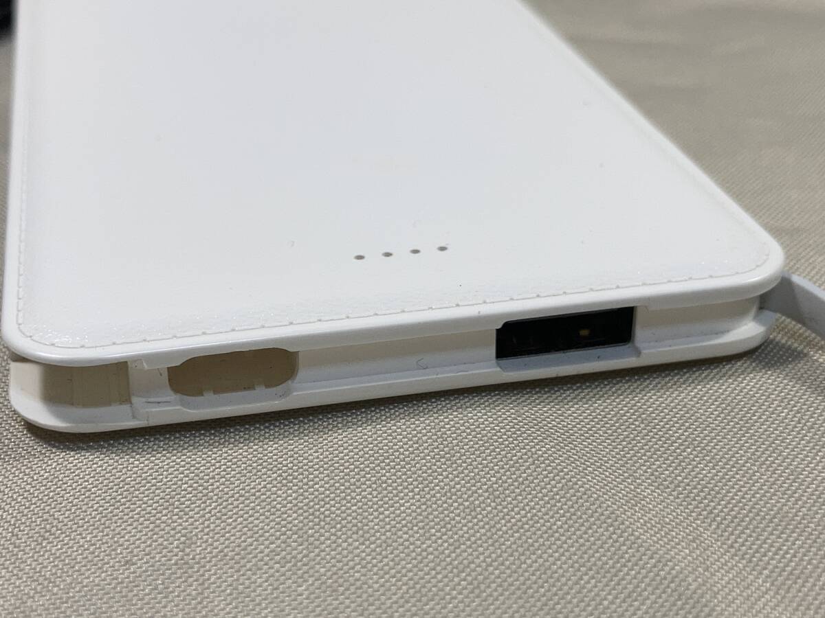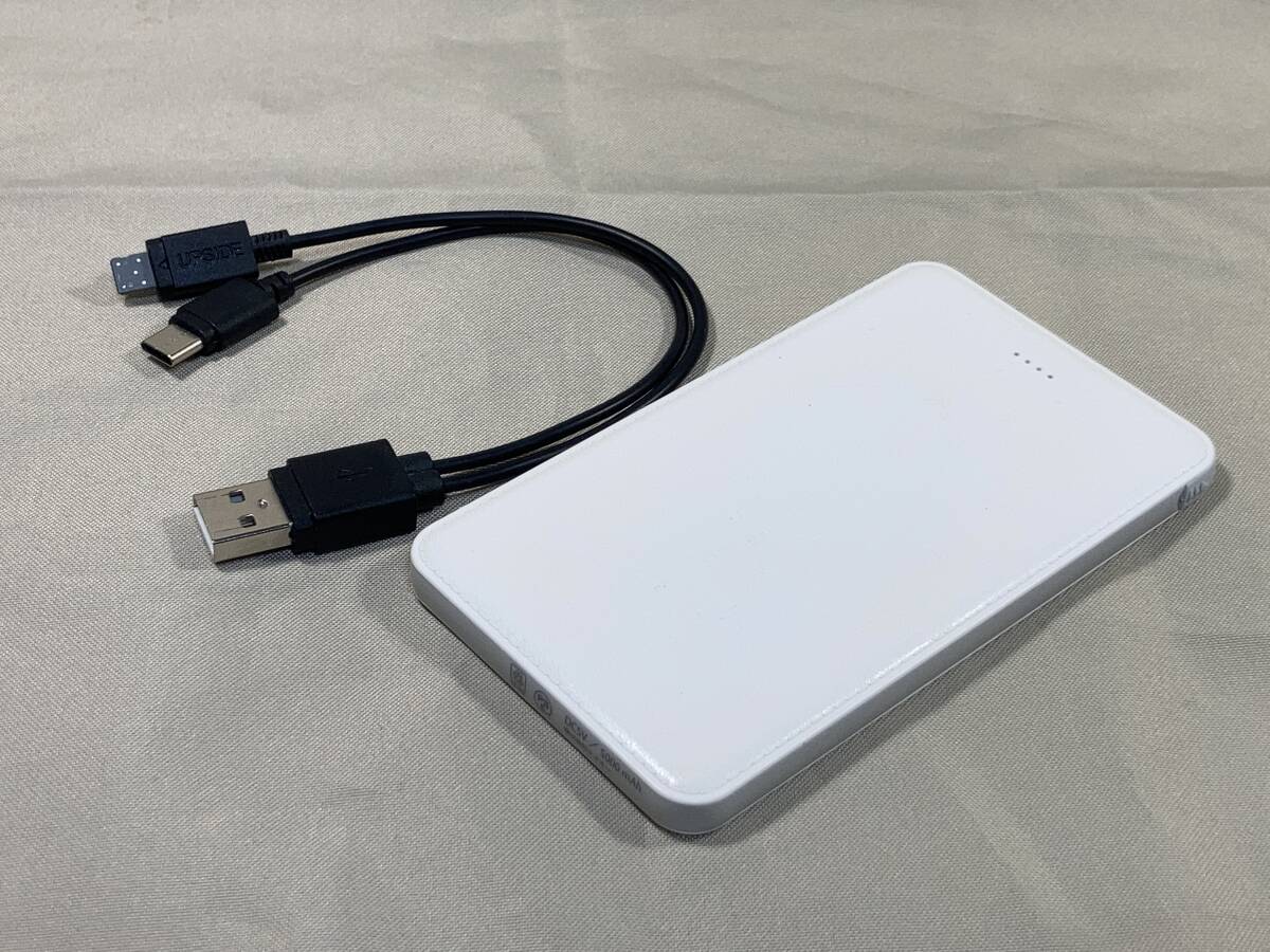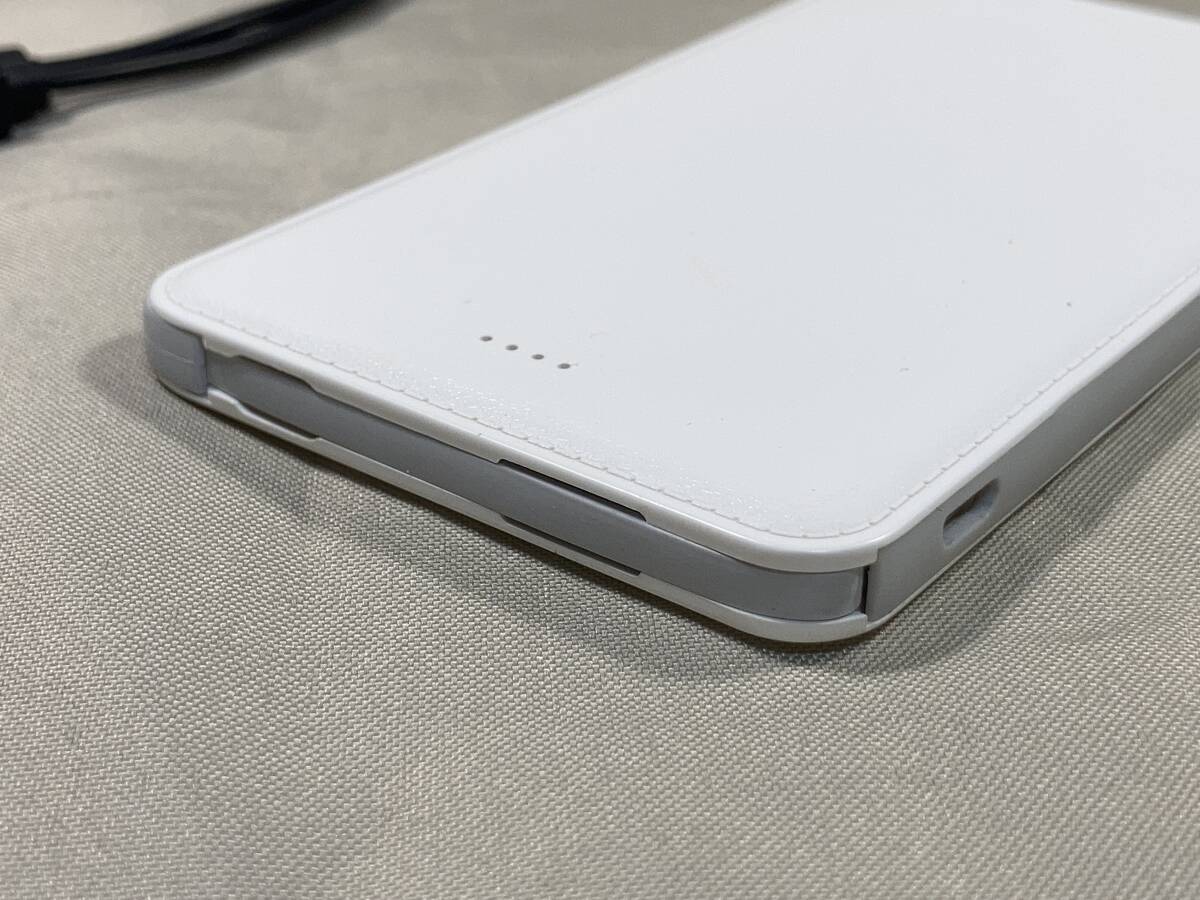 | ■メーカー ケイオー ■型番 不明 ■仕様 ・大きさ 120×68×8mm ・容量 5000mAh ・変換アダプタ(USB-A→USB-C、Lightning)添付 ・表面は合皮のような質感 ■動作 ・本体のmicroUSB(メス)ポートに接続し本体充電良好。 ・本体のmicroUSB(オス)、及び変換アダプタで出力動作確認し良好。 ・iPhoneSE2で5%→100%まで充電し、動作良好。 | ||