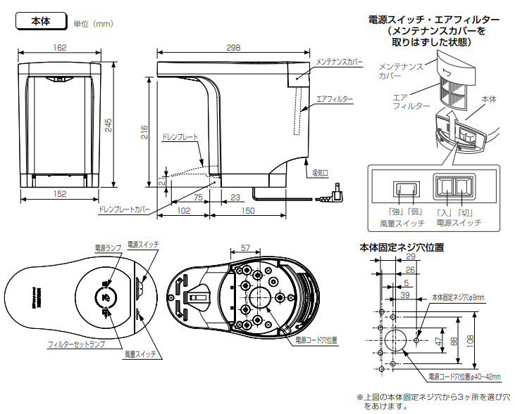 ■メーカー MITSUBISHI ■品名 ハンドドライヤー / JT-PC105A ■詳細 ![]() ■機能 ・乾燥時間:8~12秒 (強) ・風速:140m/s ・電源:100V(50Hz/60Hz) ・定格電流(A):4.7 ・消費電力(W):450/250 (強/弱) ・整流子モーター ・安全装置:温度ヒューズ・過電流遮断機能 ・電源コード:2m ・運転音:60dB ・ドレンタンクレス ・低維持費:10円で300回使用可能 ・設置面積φ約15cmのコンパクトボディ ・スピード乾燥と新開発マルチワイドノズルによる広範囲な吹き出し風を実現 ■製造年 2007年製(コード) ■参考価格 59,800円(税別) ■付属品 ドレンプレート、ドレンプレートカバー、ネジ、取扱説明書、取付工事説明書、型紙 等 ※ 画像記載のもののみです。 ![]()