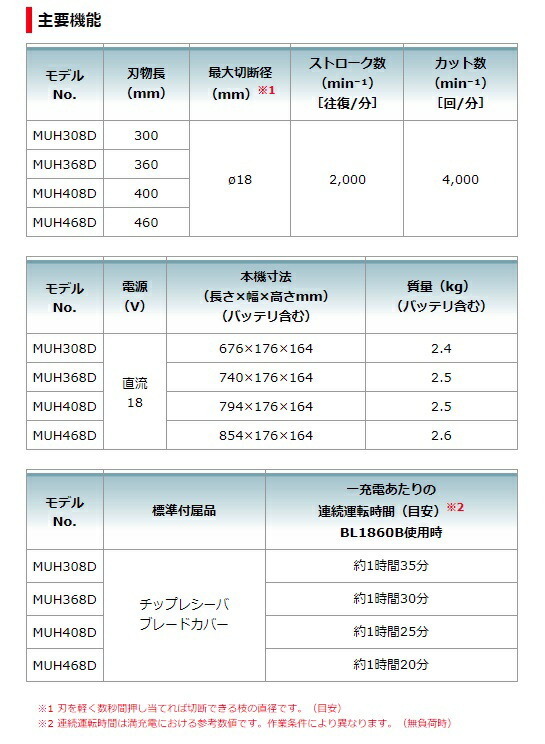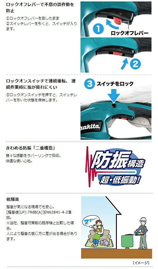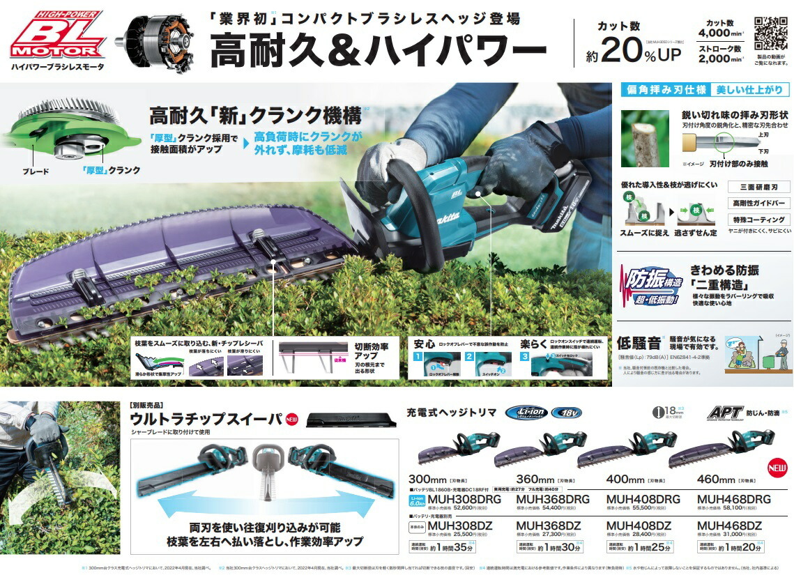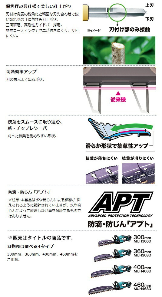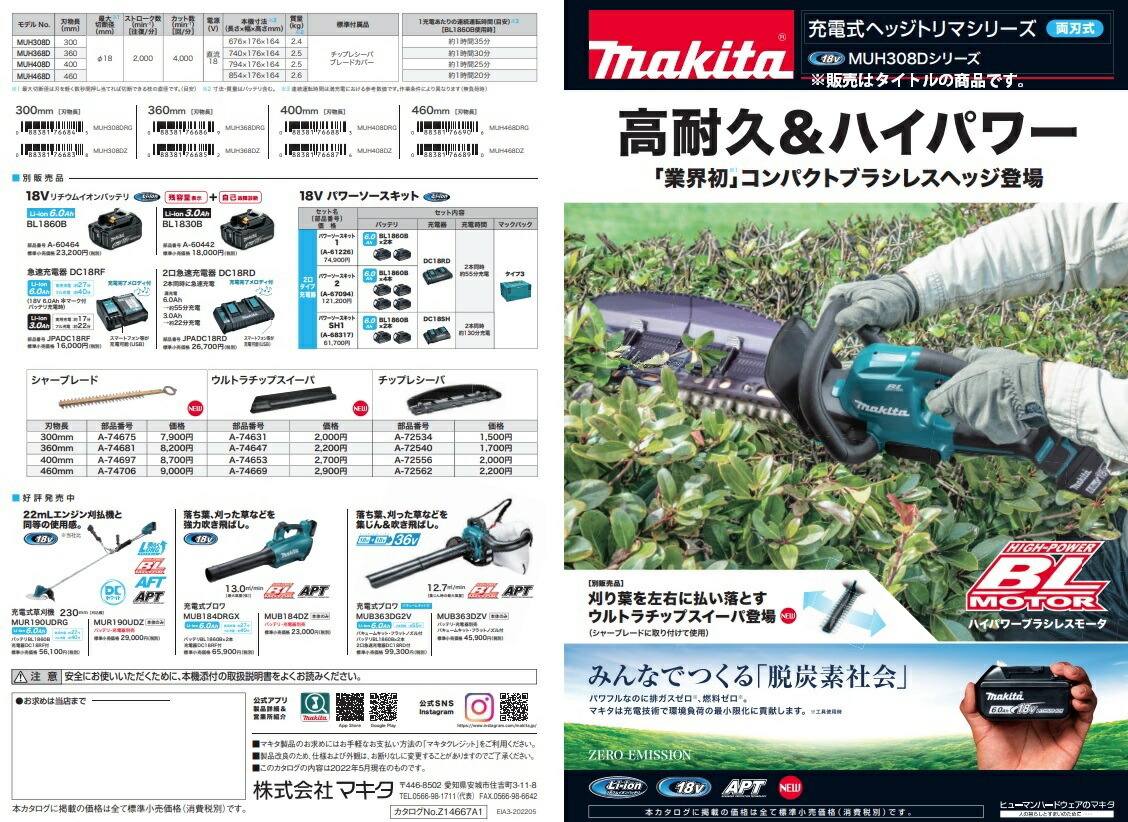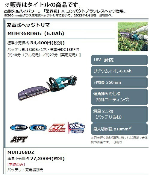 マキタ makita充電式ヘッジトリマMUH368DZ 本体のみです。※バッテリー・充電器は別販売品です。88381766852■ハイパワーブラシレスモータ搭載■長時間使えて、パワフル■高耐久「新」クランク機構■別販売品でウルトラチップスイーパをご用意両刃を使い往復刈り込みが可能。枝葉を左右へと払い落し、作業効率アップ。■ロックオフレバーで不意の誤作動を防止(1)ロックオフレバーを倒したまま(2)スイッチレバーを引くと、スイッチが入ります。■ロックオンスイッチで連続運転、 連続作業時に指が疲れにくい(3)ロックオンスイッチを押すと、スイッチレバーを引いた状態を保持します。■きわめる防振「二重構造」■低騒音■偏角拝み刃仕様で美しい仕上がり■切断効率アップ■枝葉をスムーズに取り込む、新・チップレシーバ■防滴・防じん「アプト」※注意:本製品は水や粉じんによる影響が 抑えられるように設計されていますが、水や粉じんによって故障しない事を保証するものではありません。■刃物長は選べる4タイプ300mm、360mm、400mm、460mmをご用意。