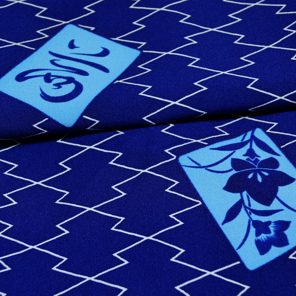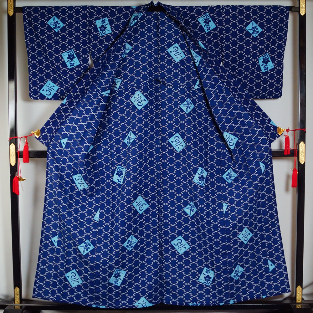 | 商品 説明 | 留紺色系の化繊ちりめん地に松皮菱に色紙に茜の字と桔梗模様が施された踊り用の単衣小紋です。替え袖(うそつき袖)がついております。 |