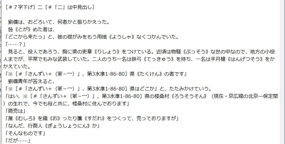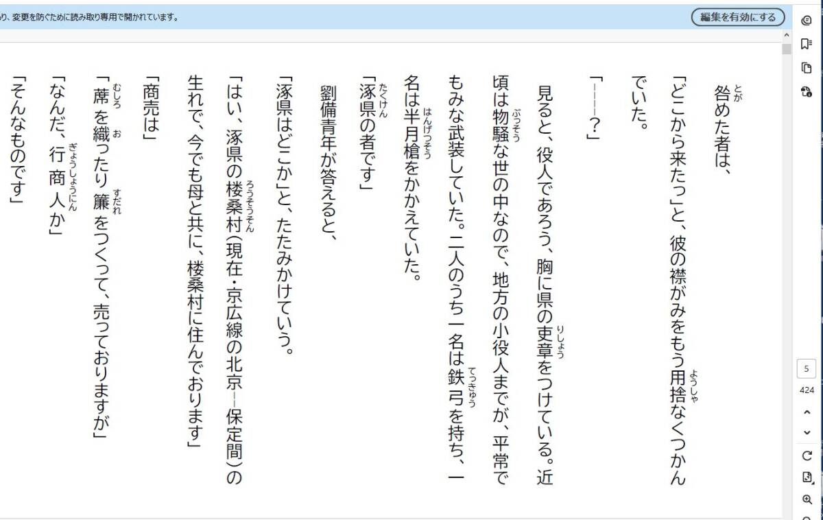 | ルビの表示 | 画像5中央部 ・ルビ対象文字の後ろに記号付きで表示 | 画像3中央部参照 ・通常のルビ表示(ごく希に不適切な場所にルビ表示あり) |