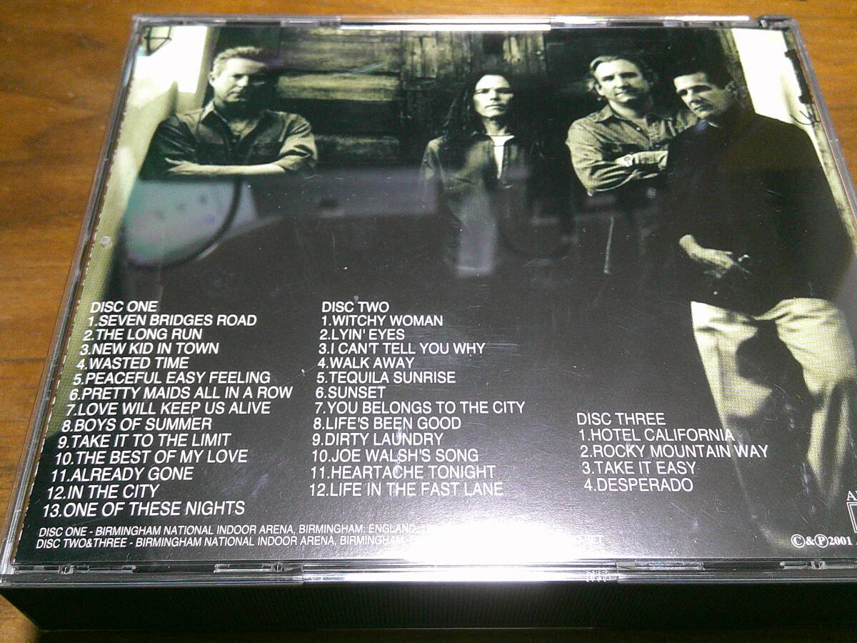 再編イーグルス、2001/7/19の2公演を収録した作品です。代表曲の数々を充実した演奏で聴かせてくれます。中古盤ですが、再生に支障があるような傷汚れはありません。