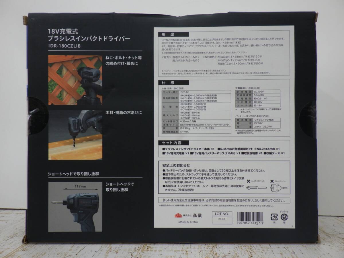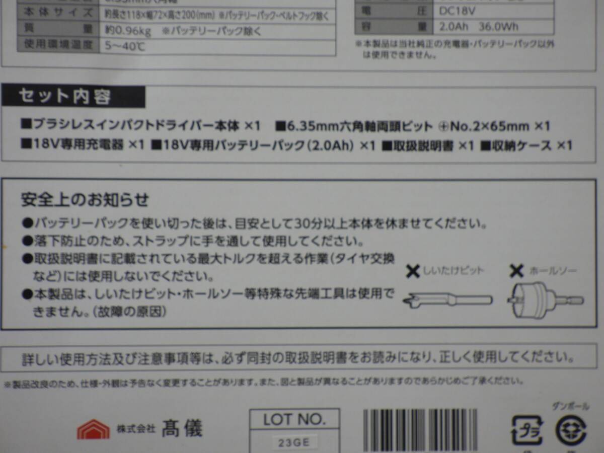 | 商品名 | ブラシレス インパクトドライバー 18V ショートヘッド 黒 バッテリー1個 充電器 未使用品 |