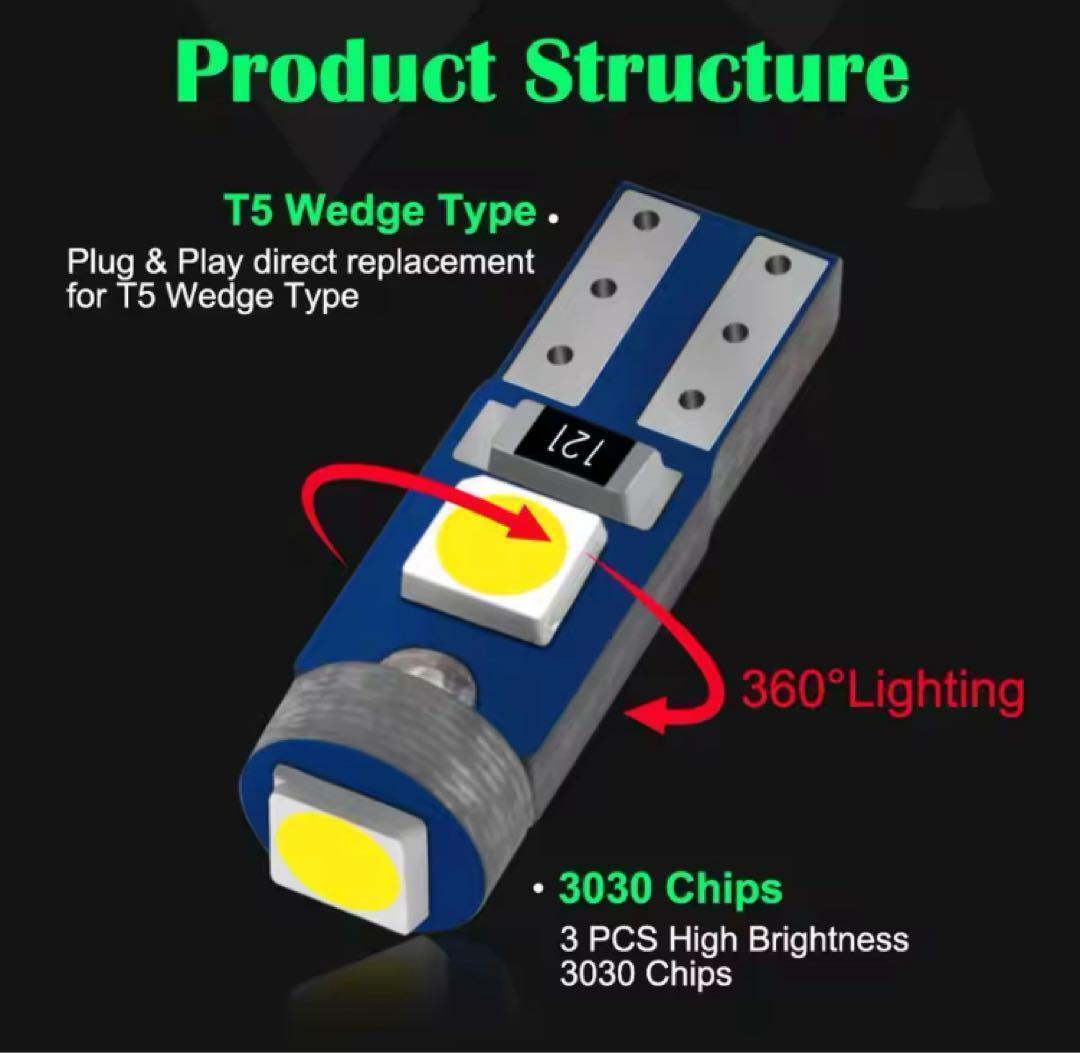 | 商品説明 | 【商品説明】 T5 LED 3030SMD 3連 ホワイト 4個 T5/T6.5/T7対応 ハイパワー3030 SMD LEDチップを3個搭載。従来品のLEDと比べ非常に明るく照射します。 T5純正電球とほぼ同じサイズで、あらゆる箇所での使用可能。 360°全方位照射で明るく照らします。 【使用用途】 メーターランプ、エアコンランプ、コンソールランプ、フットランプ、インジケーターランプ 【商品詳細】 サイズ : 全長約18mm : 全幅約6mm : 差込口幅約5mm 発光色:ホワイト 入数:4個 口金タイプ:T5 対応電圧:DC12V |