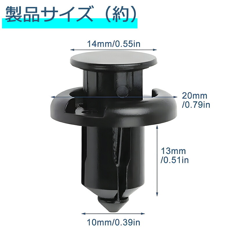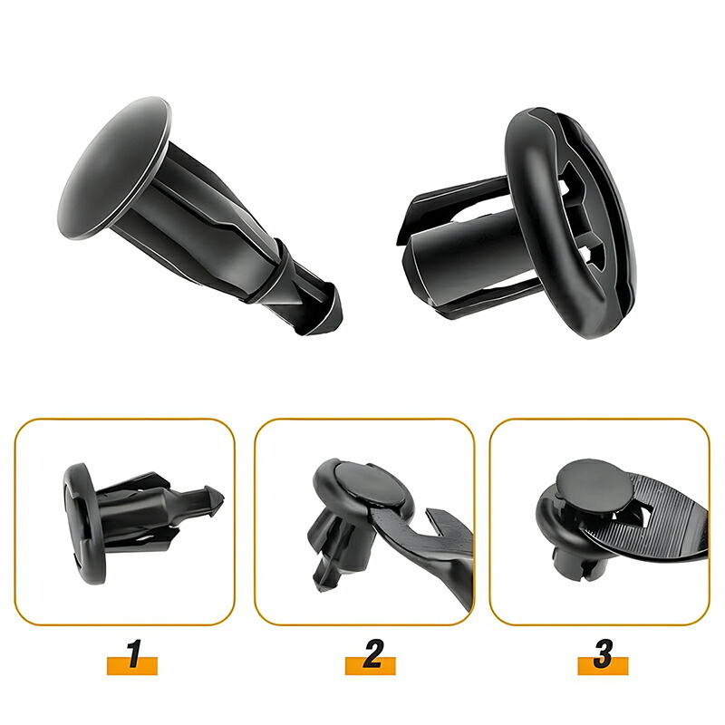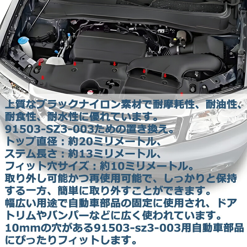 幅広い用途で自動車部品の固定に使用され、ドアトリムやバンパーなどに広く使われています。10mmの穴があるほとんどのホンダ自動車部品にぴったりフィットします。
