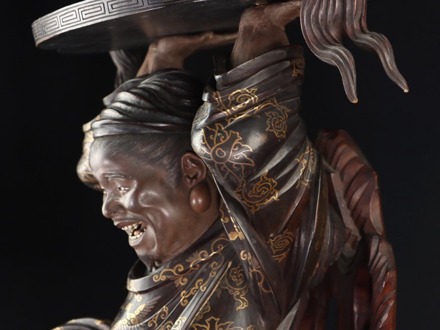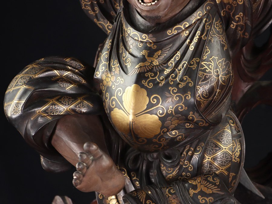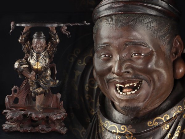 サイズ(約) 高さ 64㎝/横幅 50㎝/奥行 23㎝ 総重量 6.36㎏ 付属品 - 大名家収蔵品 江戸後期~明治期 超超超絶技巧 木彫り大黒 金蒔絵家紋唐木扇 玉眼 細部まで凄まじき彫刻業物 時代名人神業大作品! 本物保証 広島県歴史ある大名家旧蔵品! 代々、家系に伝わり家宝としている物の一部は、広島県安芸区吉田町にございます。毛利博物館などに貸し出し等をされているお方の持ち物になり、古くから蔵に保管されている、美術品を今回、お許しをいただきまして出品させていただくことになりました。 大変希少な逸品でございます。 写真より、数十倍、数百倍、蒔絵美しく、本金仕上げ、おそらく、時代名工、名人作間違いなしのお品となっております。 木彫り彫刻にて制作された作品で、表情、構図、出来栄え、全てが超一流、神業彫刻で仕上げられた時代木彫り作品です! 髪の毛やお顔のしわ、腕や足の血管まで忠実に再現されております。 特にお顔は玉眼、口内には歯が一つ一つ作られており、どの角度から見ましても神様が楽しく踊る様を彫刻にて再現された神業の作品になります! お召し物は金銀蒔絵、しわのよれまで彫刻で再現されております! 私も多くの彫刻作品を見てきましたが、ここまで細部までこだわった木彫り作品は見たことがございません! に出品するか大変迷いましたが、良い作品を皆様に見ていただきたく、今回は特別に出品させていただきました! 正に唯一無二の大変ずば抜けた彫刻業で仕上がられた作品になります。 状態、近年、蒔絵師、塗師により補修していると前持ち主様よりお聞きしております。 手の指部分や扇の留め部分は補修されていると思います、それから背中部分に台と固定するためボルトで固定されております。 画像の通り綺麗な状態の作品になります。 大事にしていただける方の入札お待ちしております! ※厳選された由緒、歴史ある名家出の作品で、他に類なきお品となっております。格安スタートにて出品させていただきますが、あまりにもお安い価格ではお譲りはできませんので、出品を取り消しする場合がございます。その旨ご理解いただき入札の方お願いいたします! |