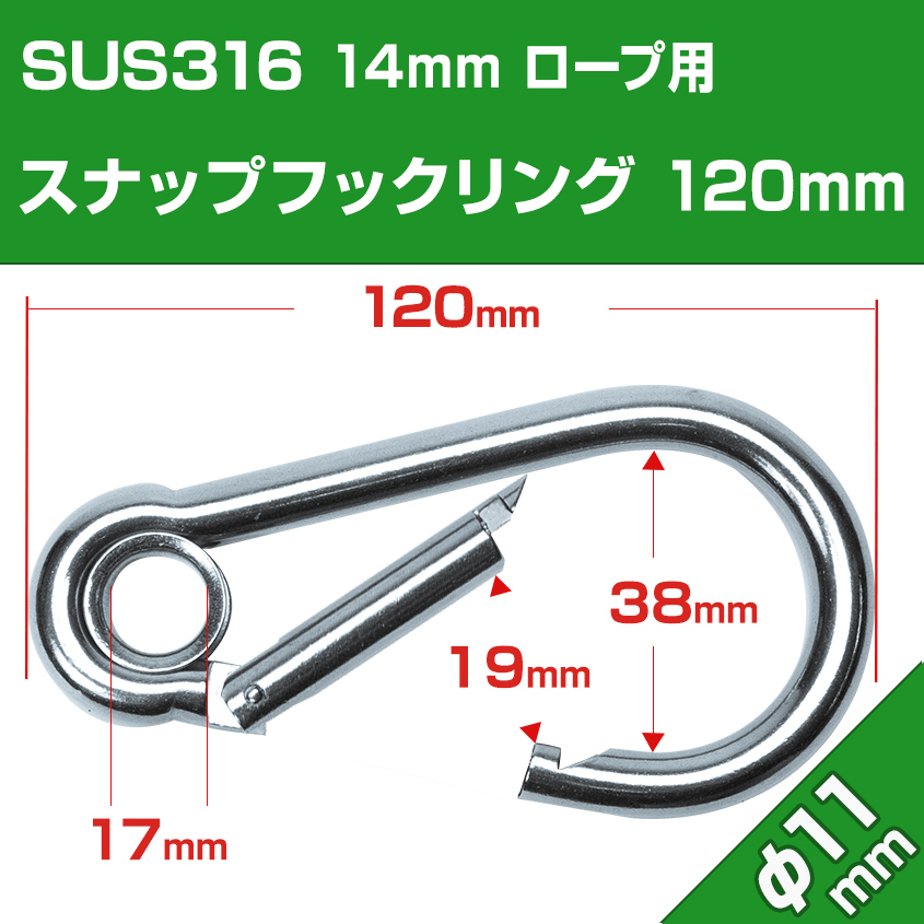 フェンダー取付金具や係留金具に最適な sus316 ステンレス リング付き スナップフック 120mm φ11mm です。