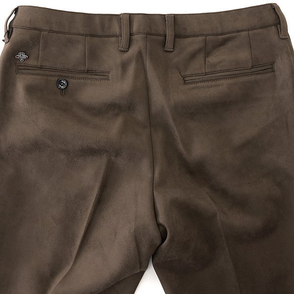 リッチな艶感と重厚感が漂うヌバック調ジャージー素材のスラックスです。 リアルヌバックのようなふっくらとした肉感のボンディングジャージー素材を使用し、重厚なルックスに相反する、快適で軽い着用感に仕上がっています。 緩やかにテーパードを描く美しいシルエットに、生地を摘まんで縫い上げるプリーツ仕上げを採用し、どんなに動いても消えない永久クリースラインでドレッシーなルックスを実現させています。 伸縮性と形状安定性に優れている素材なので、シワになりにくいのもポイントです。 滑らかな素材感と上品な光沢感で、スタイリングが大人っぽくエレガントに決まります。 ドレッシーなセットアップスタイルから、スポーティーなセットアップスタイル、ドレス&スポーツをミックスさせた時代感あるスタイルまで、シーンやお好みに合わせて多くのスタイリングをお楽しみいただけます。 同生地のジャケット(6-30203)を合わせて、セットアップスタイルも可能です。 【デザイン】 ・ノータック ・ジッパーフライ ・テーパードシルエット ・ウエストにゴムとドローコード入り |