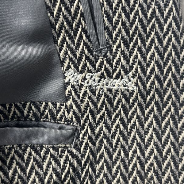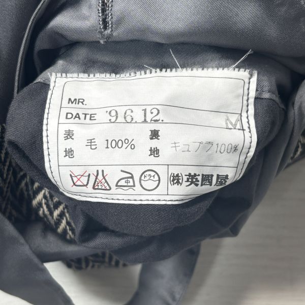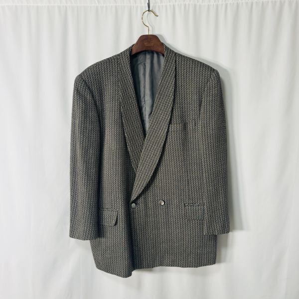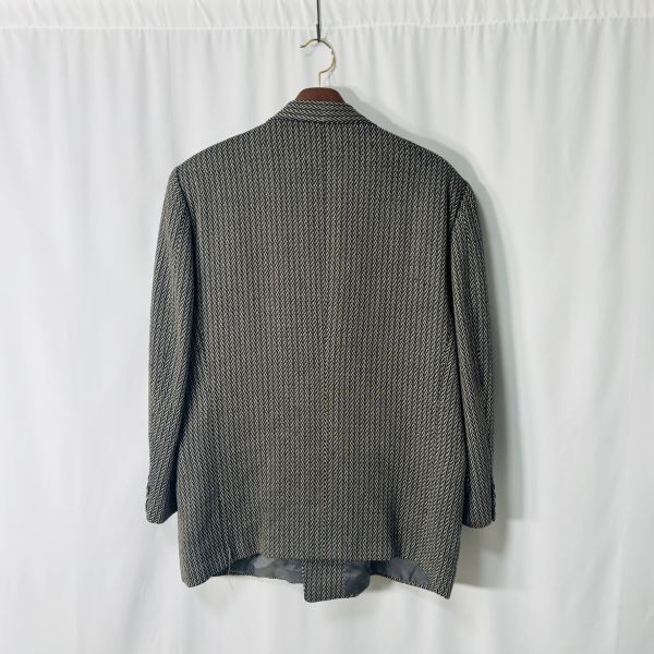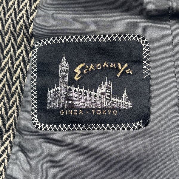銀座「英國屋(Eikokuya)」で仕立てられた高級オーダーメイドのダブルジャケットです。 上質なウール100%素材を使用し、ブラウン×ベージュのヘリンボーン柄がクラシカルで重厚感のある印象。 程よい厚みと柔らかさを兼ね備えた生地で、秋冬のフォーマルスタイルに最適です。 ピークドラペルを採用したエレガントなデザインで、英国調の品格を感じる一着。 裏地にはキュプラを使用し、なめらかで快適な着心地に仕上げられています。 銀座仕立てならではの丁寧な縫製と美しいシルエットが魅力です。 【サイズ(約)】 肩幅:49cm 身幅:56cm 袖丈:59cm 着丈:83cm 【素材】 表地:ウール100% 裏地:キュプラ100% 【仕立て】 ・ピークドラペル ・内ポケット付き 【カラー】 ブラウン×ベージュ(ヘリンボーン柄) 【状態】 全体的にきれいな状態で、裏地や縫製も良好です。 年代を考慮しても丁寧に保管されており、銀座英國屋の上質な仕立てが際立つコンディションです。 画像のものがすべてです。