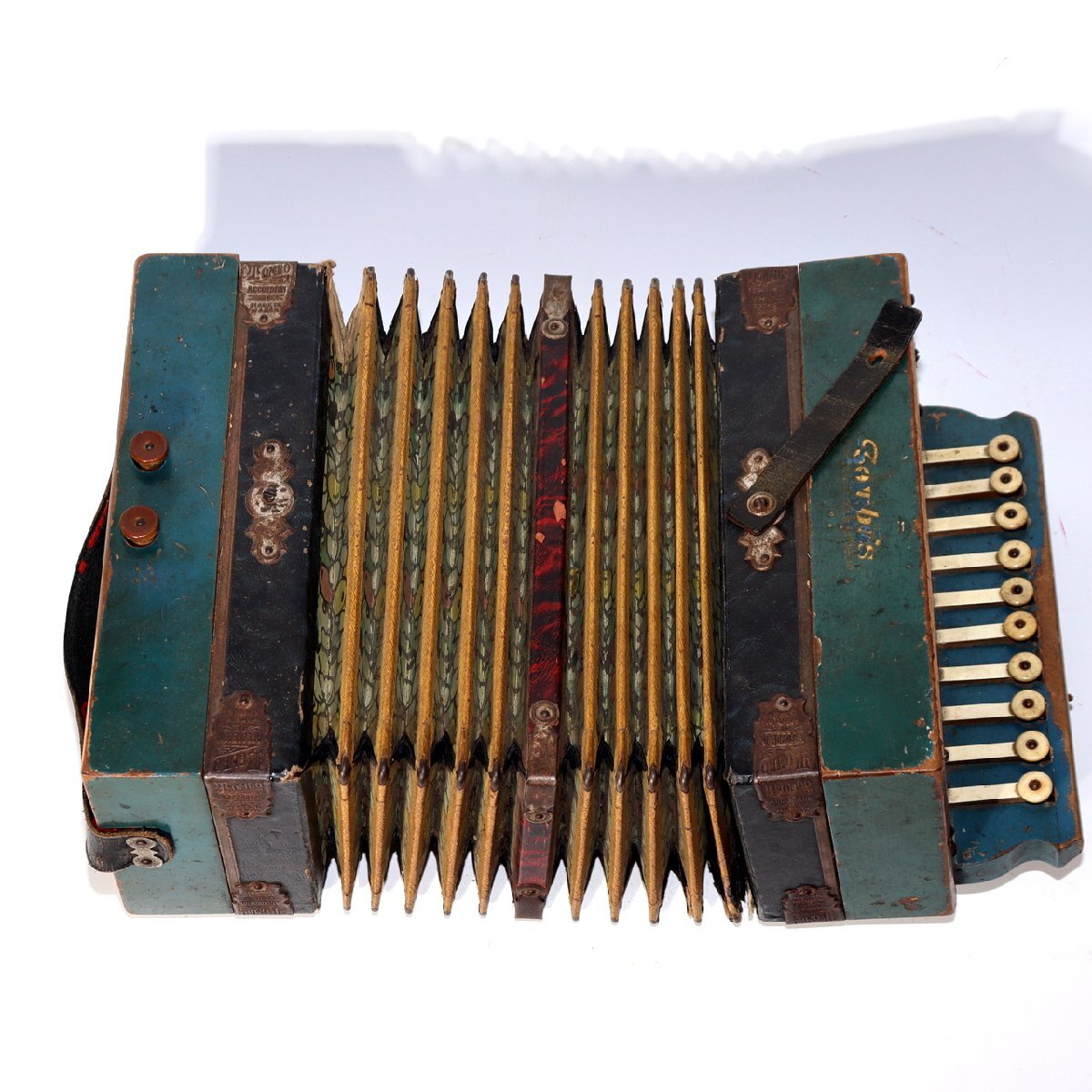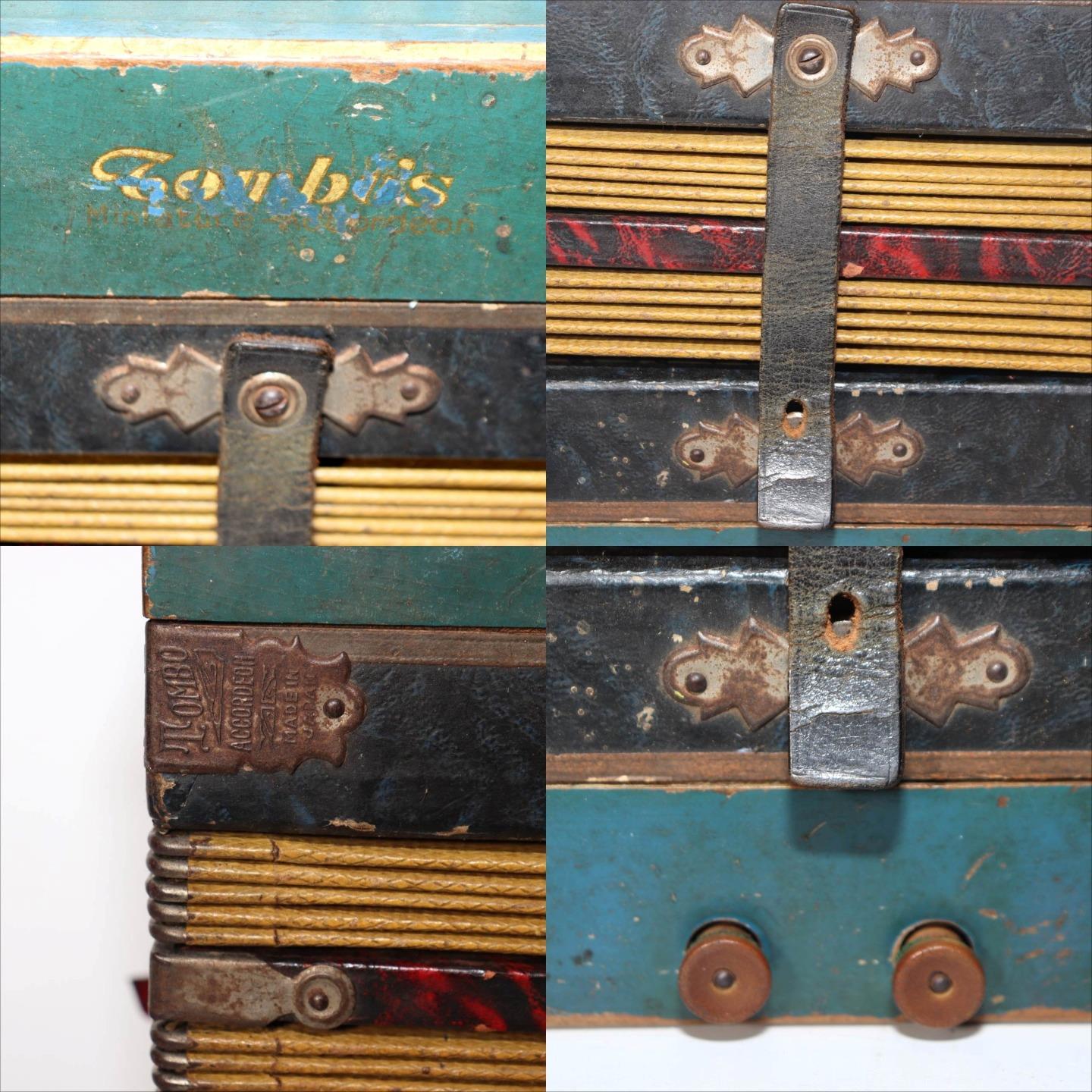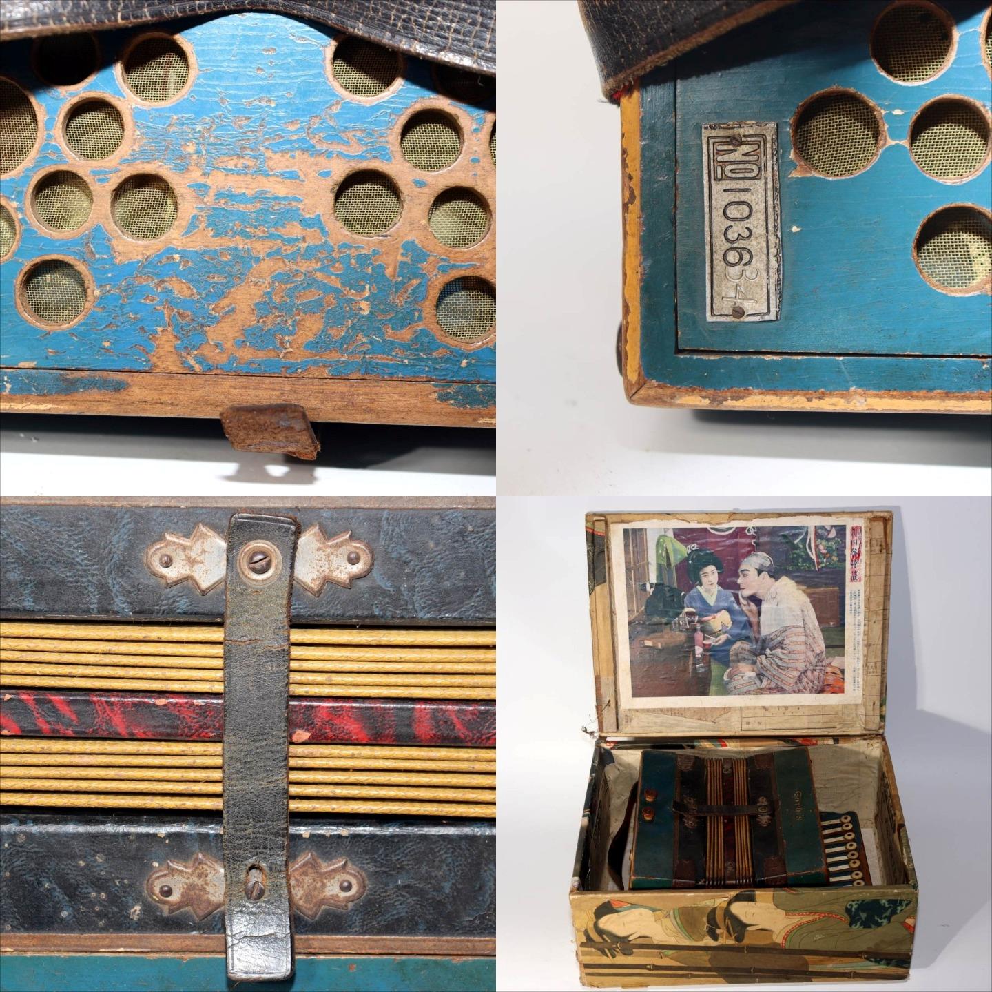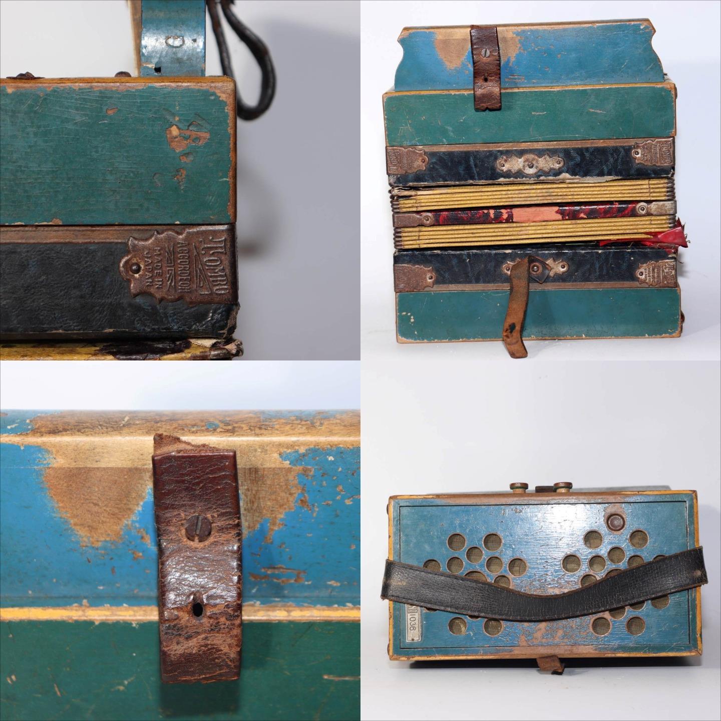こちらは、日本の老舗楽器メーカー「トンボ(TOMBO)」によるボタン式アコーディオンです。 創業は大正6年(1917年)。戦後の昭和期にはハーモニカやアコーディオンを世界各国に輸出し、 日本の楽器製造を代表する存在として知られました。 本品は手作業で仕上げられた木製ボディを持ち、 緑青色の装飾パネルと模様入り蛇腹が特徴のクラシカルなデザインです。 当時の音楽教育や家庭演奏に使われた文化的価値の高い一台です。 付属の収納箱(おそらく当時のものではありません)には、 新四谷怪談のイラストが内張りとして残されており、 昭和の楽器文化を伝える資料的価値も感じられます。 【特徴】 製造元:トンボ楽器製作所(TOMBO / 日本) 種類:ボタン式アコーディオン(手工製) 材質:木製ボディ 色:緑青色ボディ/装飾蛇腹 刻印:「TOMBO ACCORDION Made in Japan」 付属:収納箱付き(内側に印刷イラストあり) 【サイズ】 アコーディオン本体:長さ 約27cm 幅 約21.5cm 重量 約1.4kg 収納箱:33.5 × 25.5 × 13.5cm 総重量:約2.66kg 【状態】 経年による汚れ・錆び・塗装の剥がれ・退色が見られます。 蛇腹とストラップにも使用感があり、演奏用ではなく装飾・コレクション向きです。 時代感のある風合いとしてお楽しみください。 音楽・民芸・昭和レトロコレクションとしておすすめの逸品です。ぜひご検討ください。 ![]() ![]() ![]() ![]() ![]() ![]() |