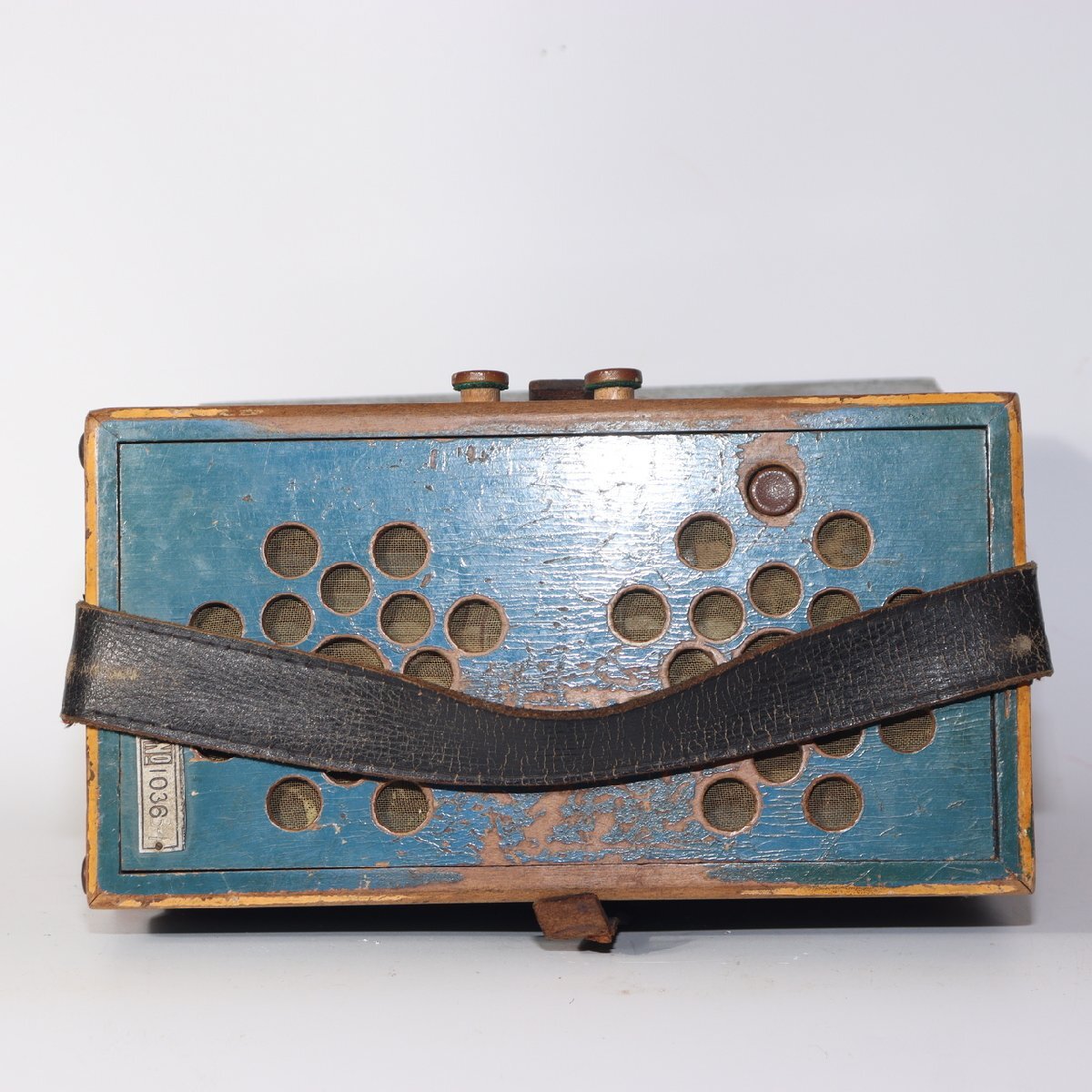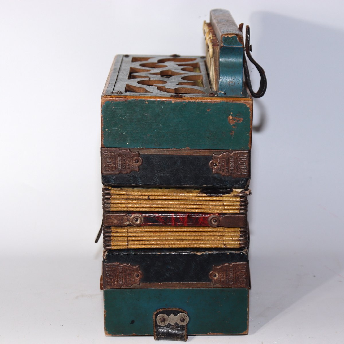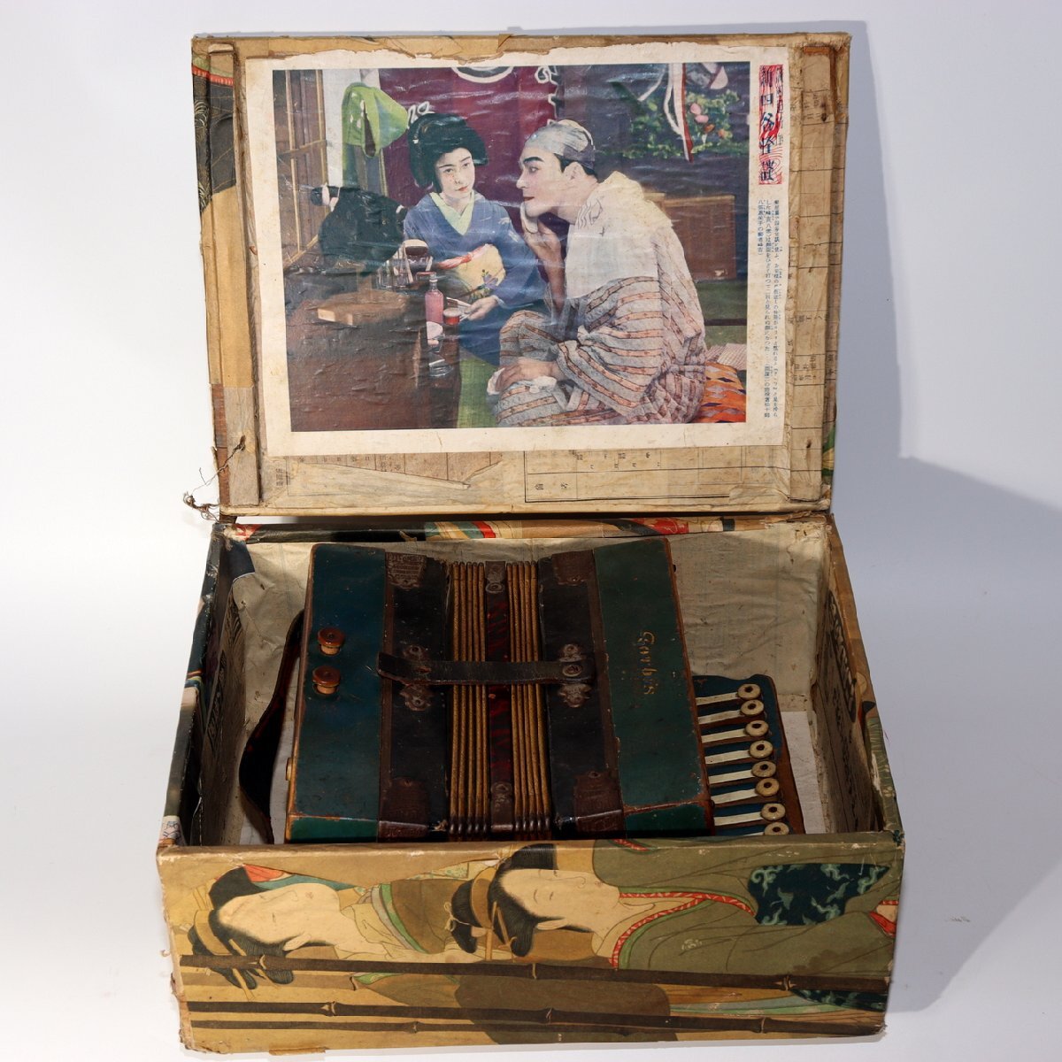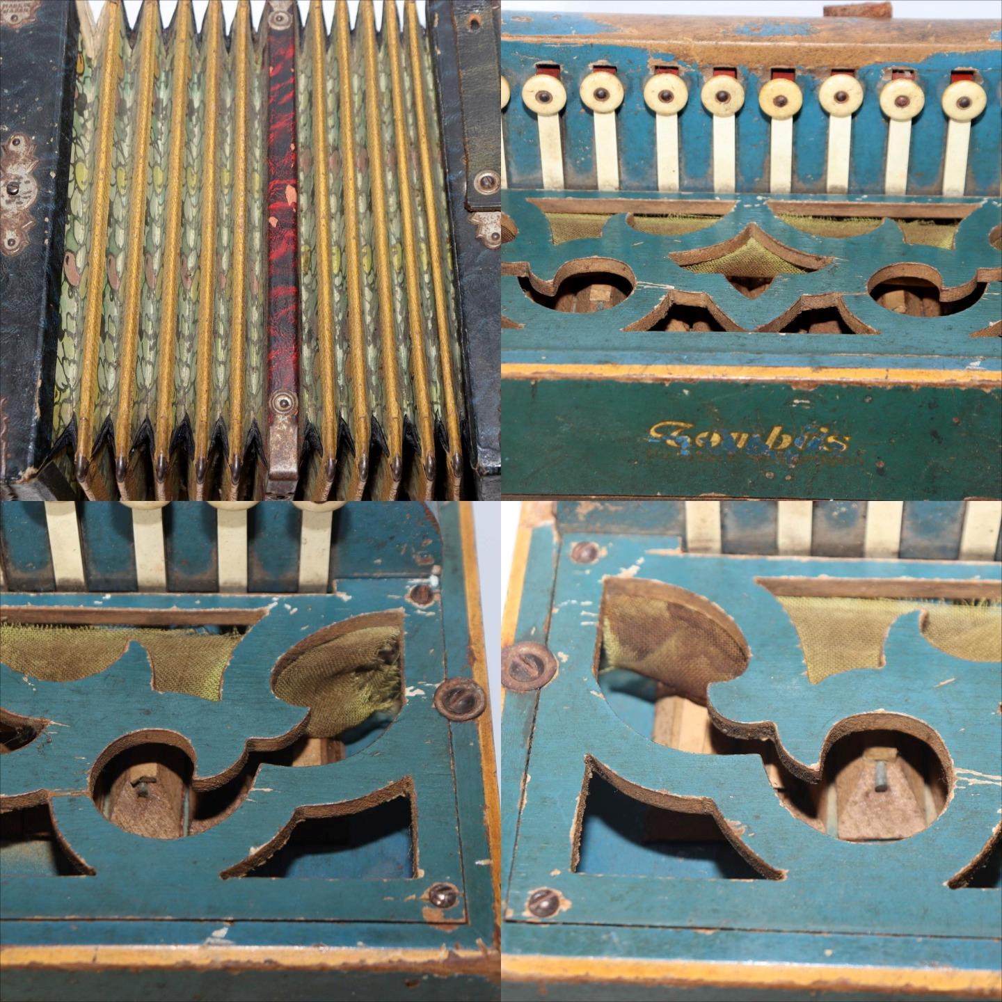こちらは、日本の老舗楽器メーカー「トンボ(TOMBO)」によるボタン式アコーディオンです。 創業は大正6年(1917年)。戦後の昭和期にはハーモニカやアコーディオンを世界各国に輸出し、 日本の楽器製造を代表する存在として知られました。 本品は手作業で仕上げられた木製ボディを持ち、 緑青色の装飾パネルと模様入り蛇腹が特徴のクラシカルなデザインです。 当時の音楽教育や家庭演奏に使われた文化的価値の高い一台です。 付属の収納箱(おそらく当時のものではありません)には、 新四谷怪談のイラストが内張りとして残されており、 昭和の楽器文化を伝える資料的価値も感じられます。 【特徴】 製造元:トンボ楽器製作所(TOMBO / 日本) 種類:ボタン式アコーディオン(手工製) 材質:木製ボディ 色:緑青色ボディ/装飾蛇腹 刻印:「TOMBO ACCORDION Made in Japan」 付属:収納箱付き(内側に印刷イラストあり) 【サイズ】 アコーディオン本体:長さ 約27cm 幅 約21.5cm 重量 約1.4kg 収納箱:33.5 × 25.5 × 13.5cm 総重量:約2.66kg 【状態】 経年による汚れ・錆び・塗装の剥がれ・退色が見られます。 蛇腹とストラップにも使用感があり、演奏用ではなく装飾・コレクション向きです。 時代感のある風合いとしてお楽しみください。 音楽・民芸・昭和レトロコレクションとしておすすめの逸品です。ぜひご検討ください。 ![]() ![]() ![]() ![]() ![]() ![]() |