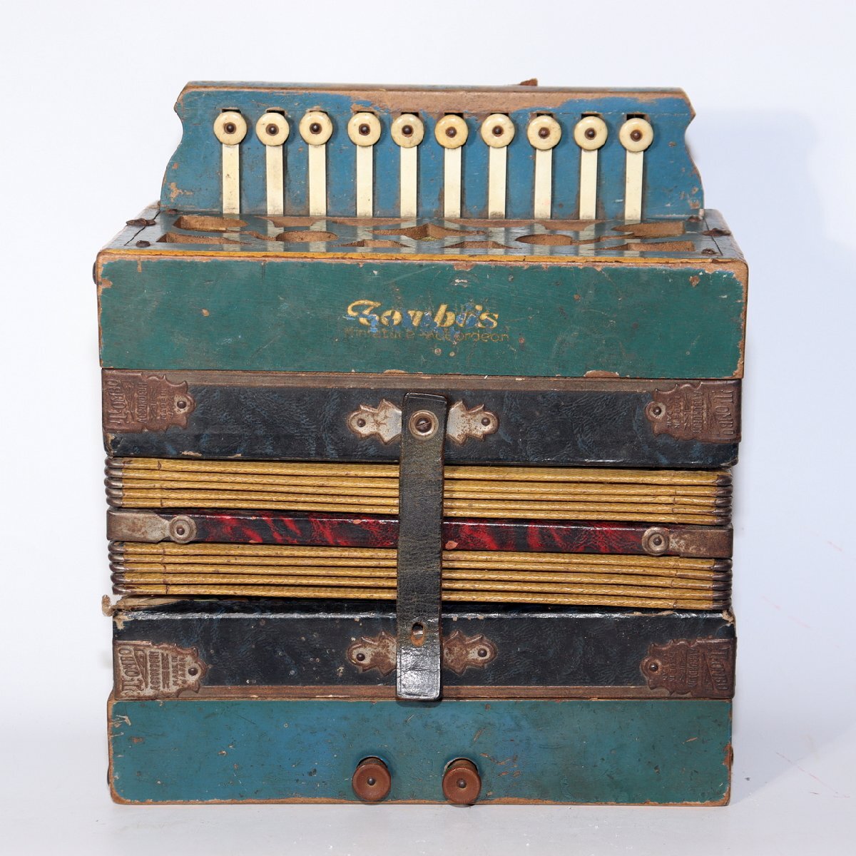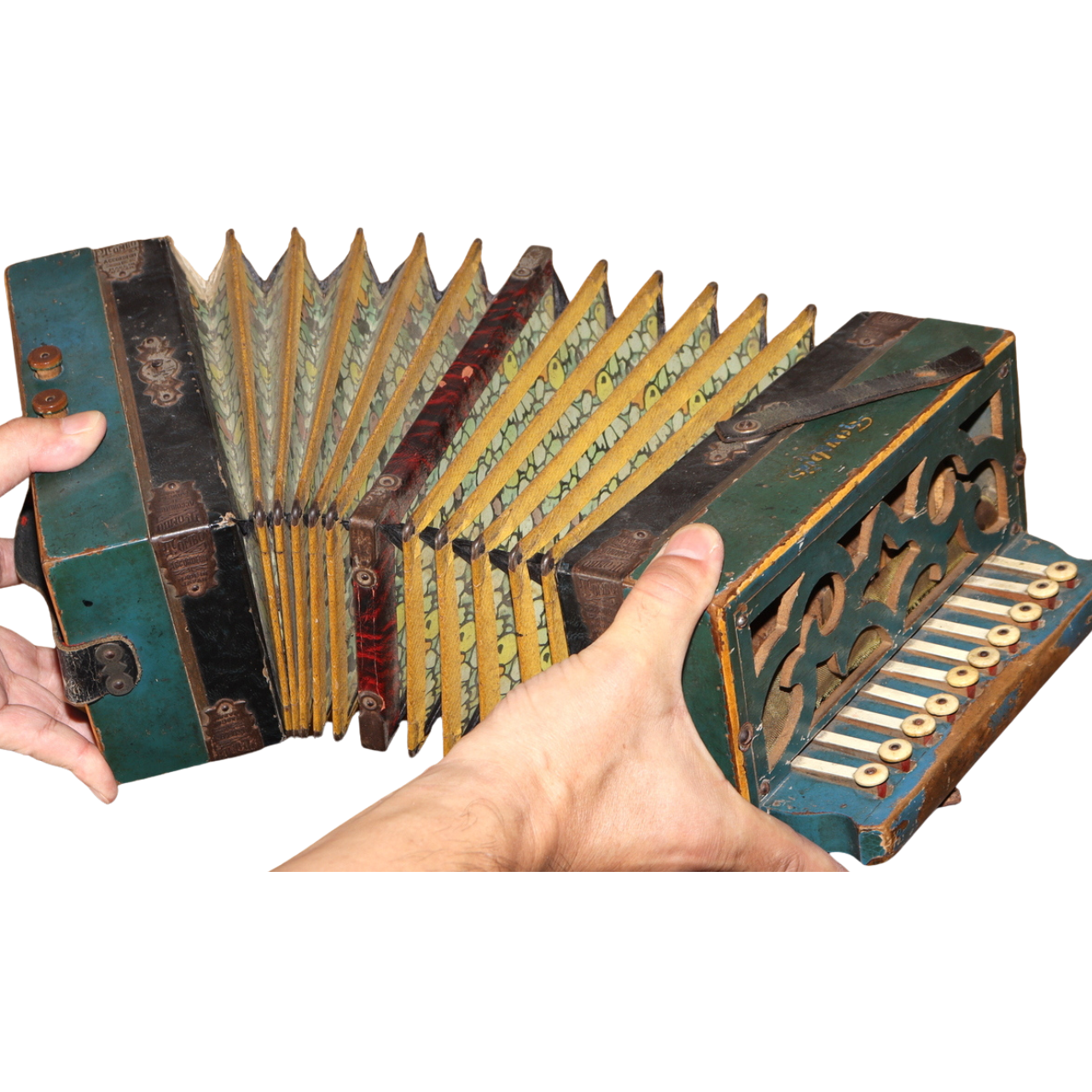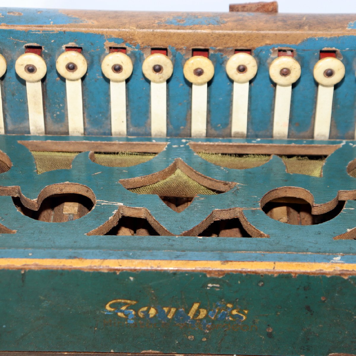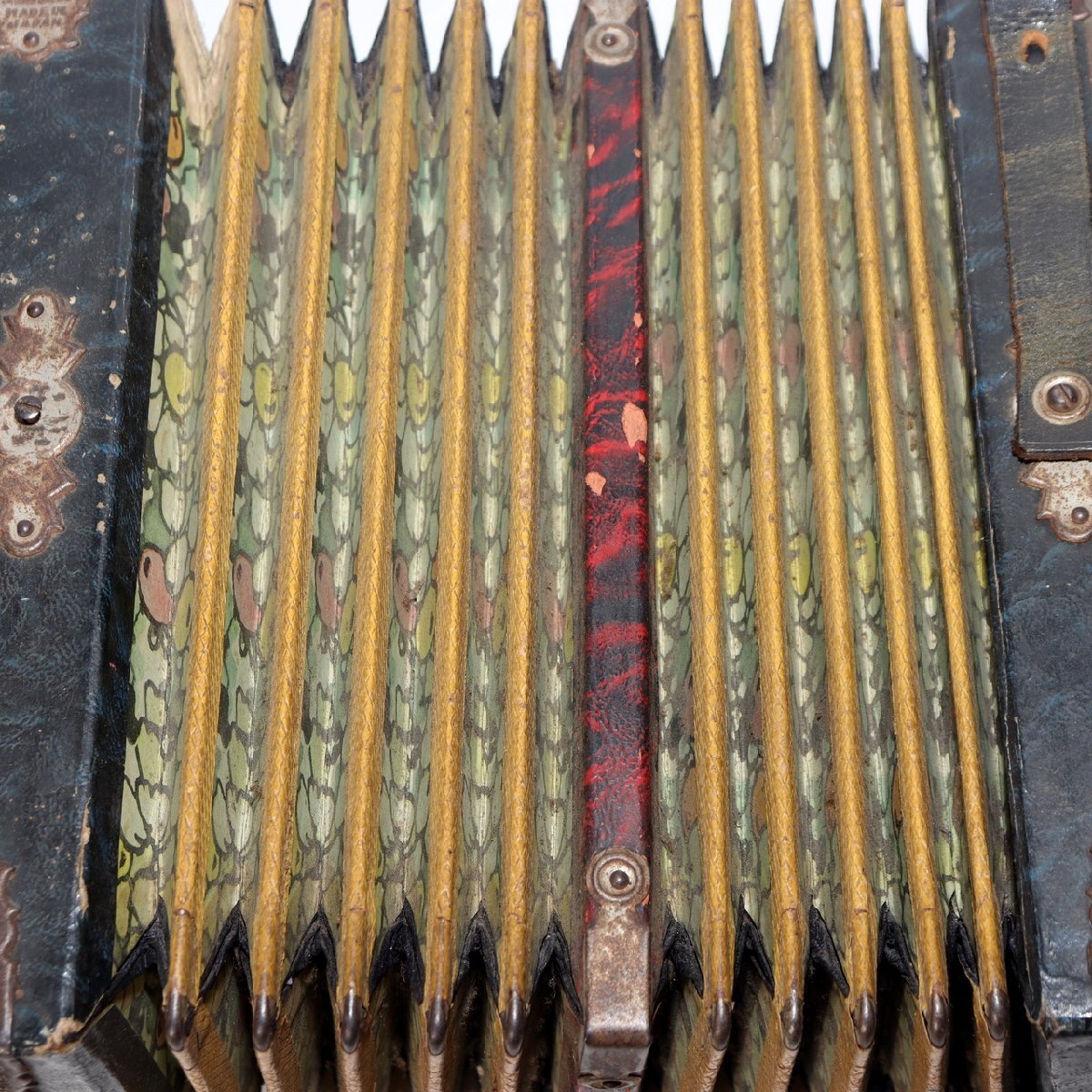 こちらは、日本の老舗楽器メーカー「トンボ(TOMBO)」によるボタン式アコーディオンです。 創業は大正6年(1917年)。戦後の昭和期にはハーモニカやアコーディオンを世界各国に輸出し、 日本の楽器製造を代表する存在として知られました。 本品は手作業で仕上げられた木製ボディを持ち、 緑青色の装飾パネルと模様入り蛇腹が特徴のクラシカルなデザインです。 当時の音楽教育や家庭演奏に使われた文化的価値の高い一台です。 付属の収納箱(おそらく当時のものではありません)には、 新四谷怪談のイラストが内張りとして残されており、 昭和の楽器文化を伝える資料的価値も感じられます。 【特徴】 製造元:トンボ楽器製作所(TOMBO / 日本) 種類:ボタン式アコーディオン(手工製) 材質:木製ボディ 色:緑青色ボディ/装飾蛇腹 刻印:「TOMBO ACCORDION Made in Japan」 付属:収納箱付き(内側に印刷イラストあり) 【サイズ】 アコーディオン本体:長さ 約27cm 幅 約21.5cm 重量 約1.4kg 収納箱:33.5 × 25.5 × 13.5cm 総重量:約2.66kg 【状態】 経年による汚れ・錆び・塗装の剥がれ・退色が見られます。 蛇腹とストラップにも使用感があり、演奏用ではなく装飾・コレクション向きです。 時代感のある風合いとしてお楽しみください。 音楽・民芸・昭和レトロコレクションとしておすすめの逸品です。ぜひご検討ください。 ![]() ![]() ![]() ![]() ![]() ![]() |