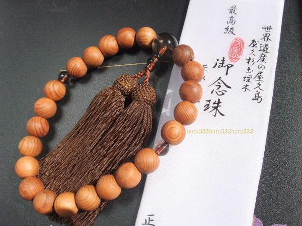 | 屋久杉 数珠 世界遺産の屋久島 屋久杉出埋木 高級国産木材である屋久杉。細やかでとても美しい木目が特徴で、高級家具などに昔から重用されてきた屋久島に生息する貴重な木です。その屋久杉の繊細な木目とほのかで清清しい香りをそのまま数珠に仕立てた、とても上品で清楚な逸品です。 □ 商品仕様 埋木屋久杉 主玉サイズ: 13mm 茶水晶石 親玉(大)16㎜ ・二天玉(小)9㎜ 正絹頭付房 桐箱入り 屋久杉 シリーズ・チェツク | ||