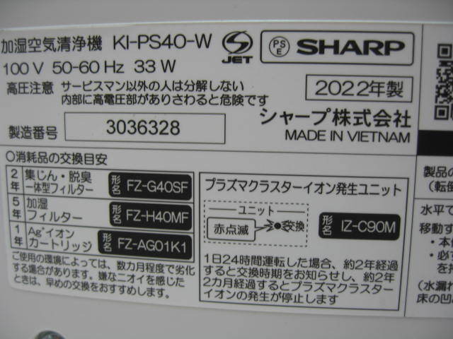 ★空気清浄機 SHARP / シャープ KI-PS40 良品 取り説付き 未使用フイルター