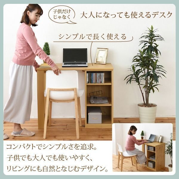 オープンラックがついたシンプルデスクです。 高さが調節できる棚が2枚ついていて、11段階で調節可能です。 デスクにフックがついているので、 手提げ袋やトートバッグがかけられる子どもにも大人にも愛される学習机です。 |