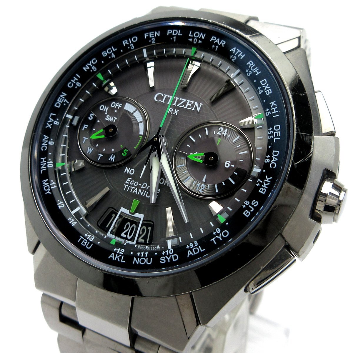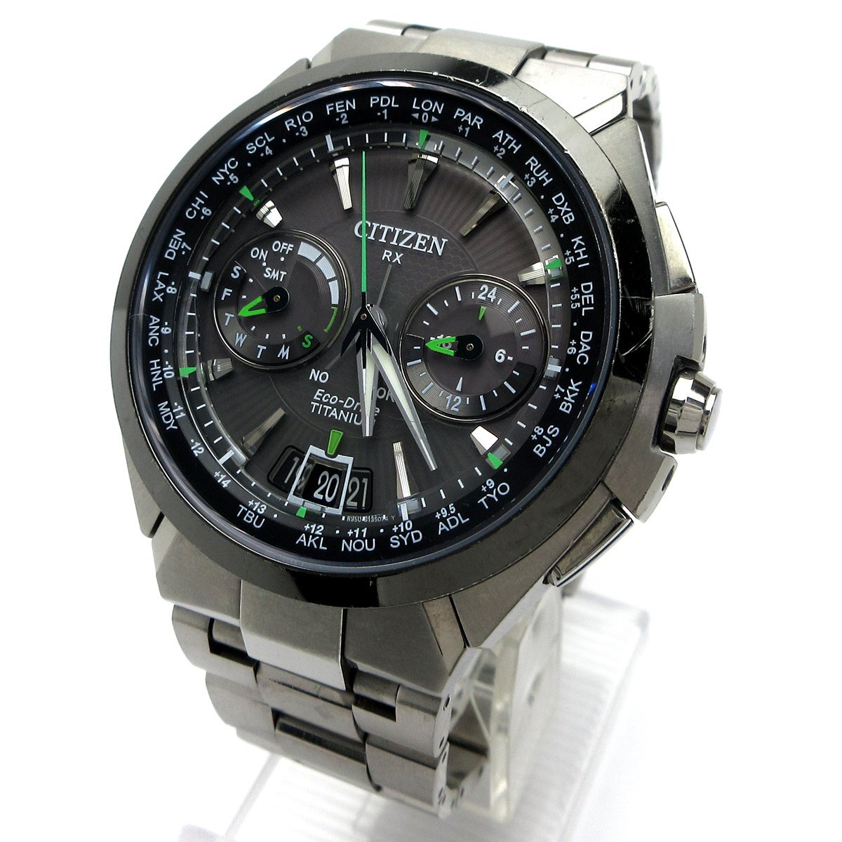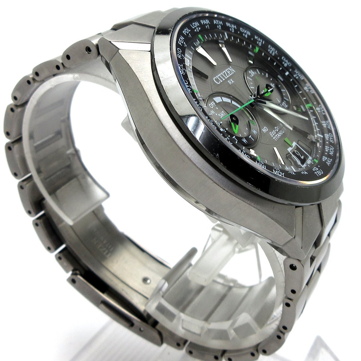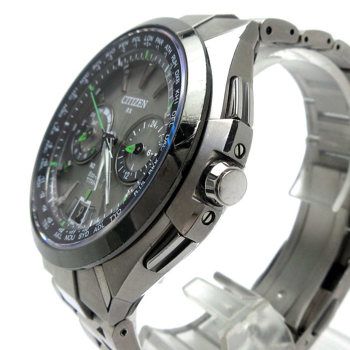 ■東京に本社をおく日本の精密・電子機器製造会社『シチズン(CITIZEN)』。 ■衛星から時刻情報を受信する『アテッサ(ATTESA) サテライトウェーブ』。 ■重厚感のあるシルエットですがチタニウム素材を使用しており軽量で装着感も良好。 ■差し色の明るいグリーンは視認性もデザイン性も良く、日常使いからお仕事など幅広く使っていただけます。 ◎ソーラー充電、衛星電波受信機能。 ◎ワールドタイム。 ◎カレンダー。 ◎WプッシュボタンつきDバックル。 ---【商品状態】--- ☆外装、クリーニング済、スリキズ、小キズあります。 ☆ベゼルにハゲのある箇所があります。 ☆ブレスサイズはコマ調整にて短くする事ができます。 ☆中古商品のため防水性の保障はつきませんのでご了承ください。 ※商品画像はお客様のモニター環境によっては色調が異なって見える場合がございますのでご了承ください。 |