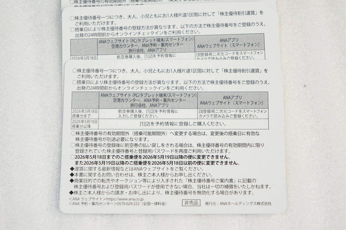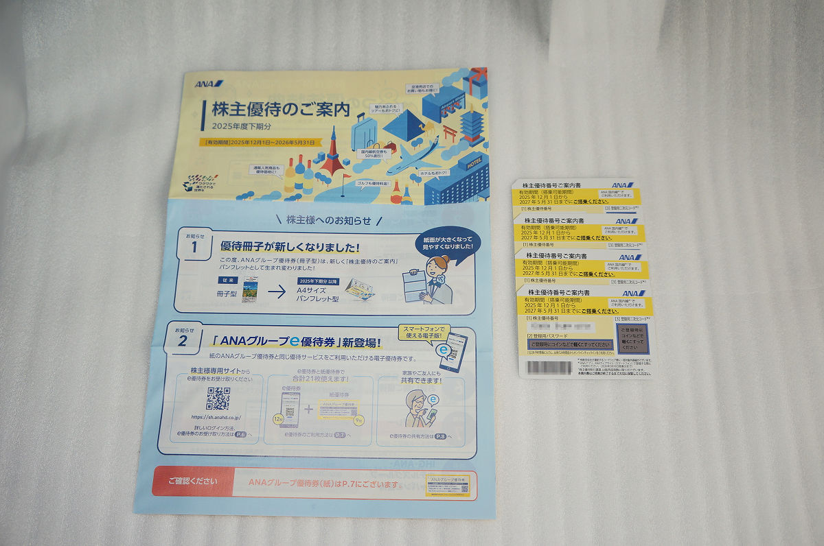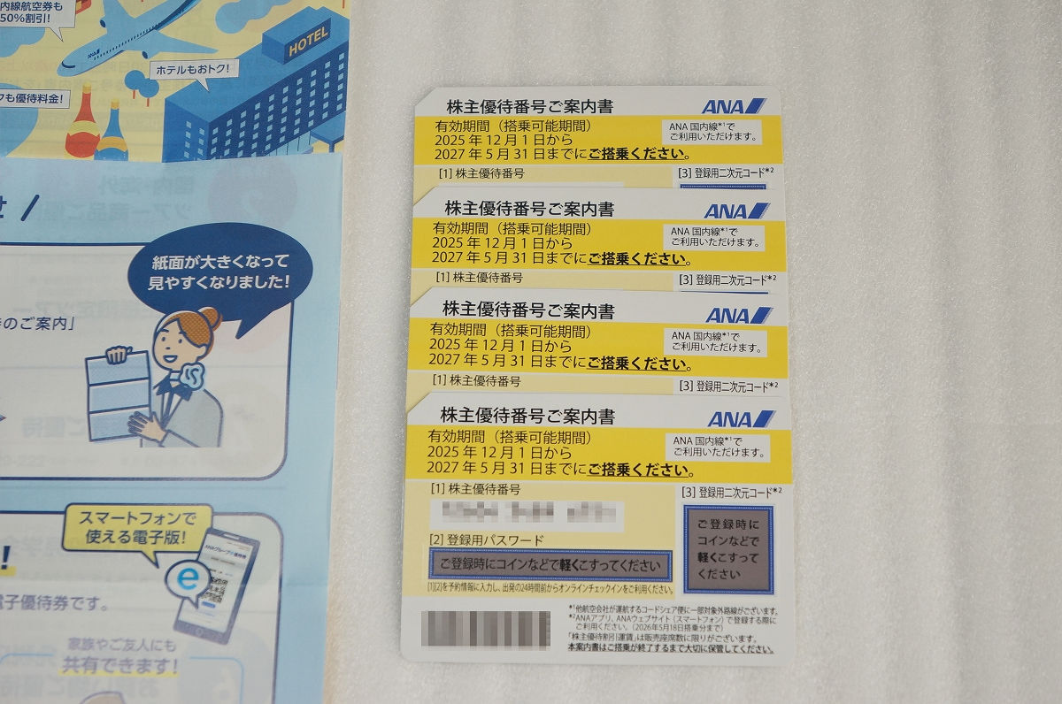 | 商品説明 | 私自身は暫く使用する予定がないので、活用いただける方・お探しの方にお譲りしたいと思います ☆ANA株主優待番号ご案内書4枚 ☆グループ優待券(冊子が1冊) ☆株主優待の有効期間(搭乗可能期間)は2025年12月1日~2027年5月31日までです ☆グループ優待券の有効期間は2025年度下期(2026年5月31日まで)です |