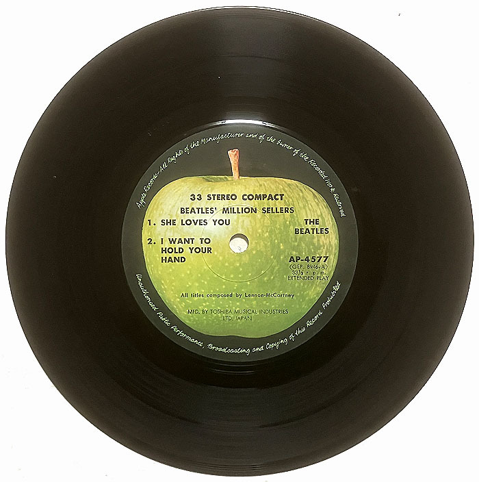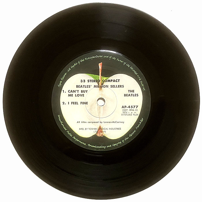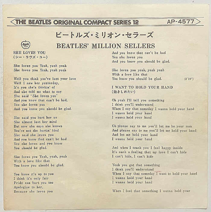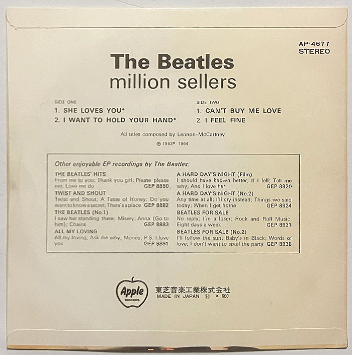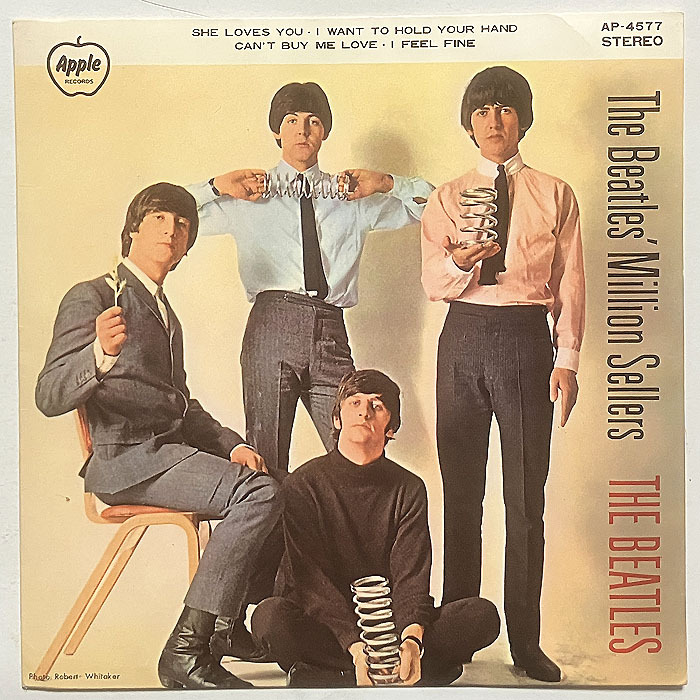 | ザ・ビートルズ EPコンパクト国内盤『The Beatles' Million Sellers』(東芝EMI AP-4577) レコード1枚 両面歌詞カード付き 封筒型ジャケット ジャケ撮影:ロバート・ウィテカー(ブッチャー・カバーButcher coverで有名) 1963年と1964年にリリースされ、世界中でミリオンセラーを記録した4曲 「She Loves You/Can't Buy Me Love/I Want to Hold Your Hand/I Feel Fine」 盤面に「よごれ・キズ」があります。 正常な再生の保証はできませんので「ジャンク品扱い」での出品です。 実物の撮影ですが、画像より実物の方が、ジャケット&歌詞カード「よごれ・シミ・シワ・縁イタミ・レコードあと」が目立ちます。 「ジャンク品」(音飛び・ノイズ)でも構わないという方のみ、入札をお願い致します。 画像以外に付属するものはありません。 | |||