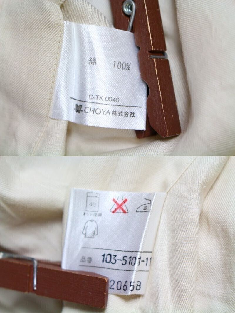 【表記サイズ】L 【カラー】暗いベージュ ※撮影時や画面の明るさにより色が変わる場合がありますのでご了承ください。 【実寸サイズ】肩幅 45㎝・着丈 74㎝・身幅 110㎝・袖丈 57㎝ ※平置き素人採寸の為、多少の誤差はご理解下さい。 【商品状態】 使用感があり画像5枚目のように目立たない程度のシミがありますがその他は大きな目立った汚れやダメージ見られません。 ※一人で状態確認をしています。見落とす場合もありますのでご了承下さい。 |