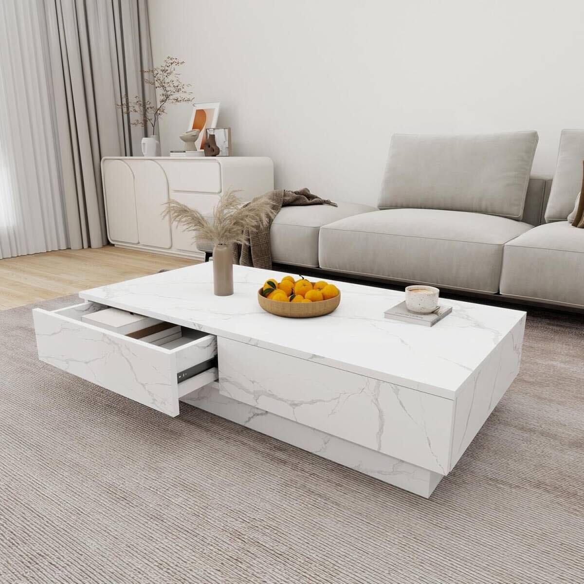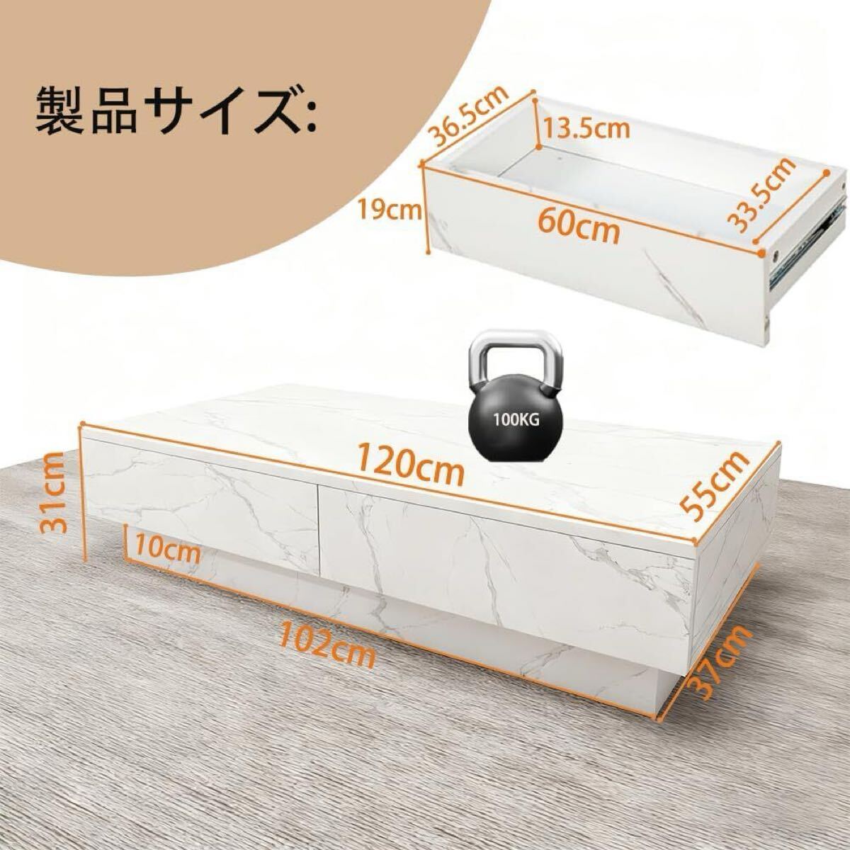 ローテーブル 大きめ センターテーブル リビングテーブル 収納付き 幅120×奥行き55 コーヒーテー木製 引き出し2杯大容量 簡単開閉 組み立て簡単 収納付き テーブル おしゃれ 多機能 高級 正規品大理石調 マーブルホワイト