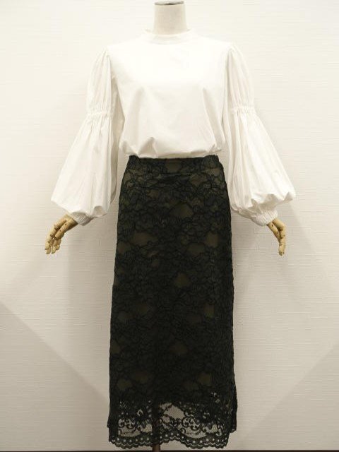 洗える長袖プルオーバーブラウス+ロング丈レースストレートスカート コーディネート上下2点セット L相当 ホワイト/カーキ地 ディープグリーン 花柄 きれいめ・クール・フェミニン系 30代~40代
