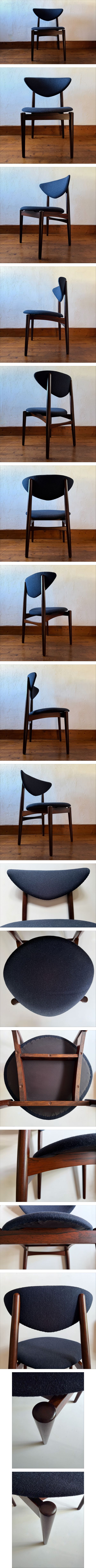 1960年代頃のデンマーク製と思われるダイニングチェア。ローズウッド材のフレームに菱形状の座面,半月状の背もたれでの構成。当方,知識がなくデザイナー,工房等は未確認でございます。状態…ファブリックは近年張り替えられていえる様で極美。フレームには僅かなスレ,小キズがある位で綺麗です。寸法…W52xD49.5xH77.5cm.SH44cm。ご入用の方どうぞ。
