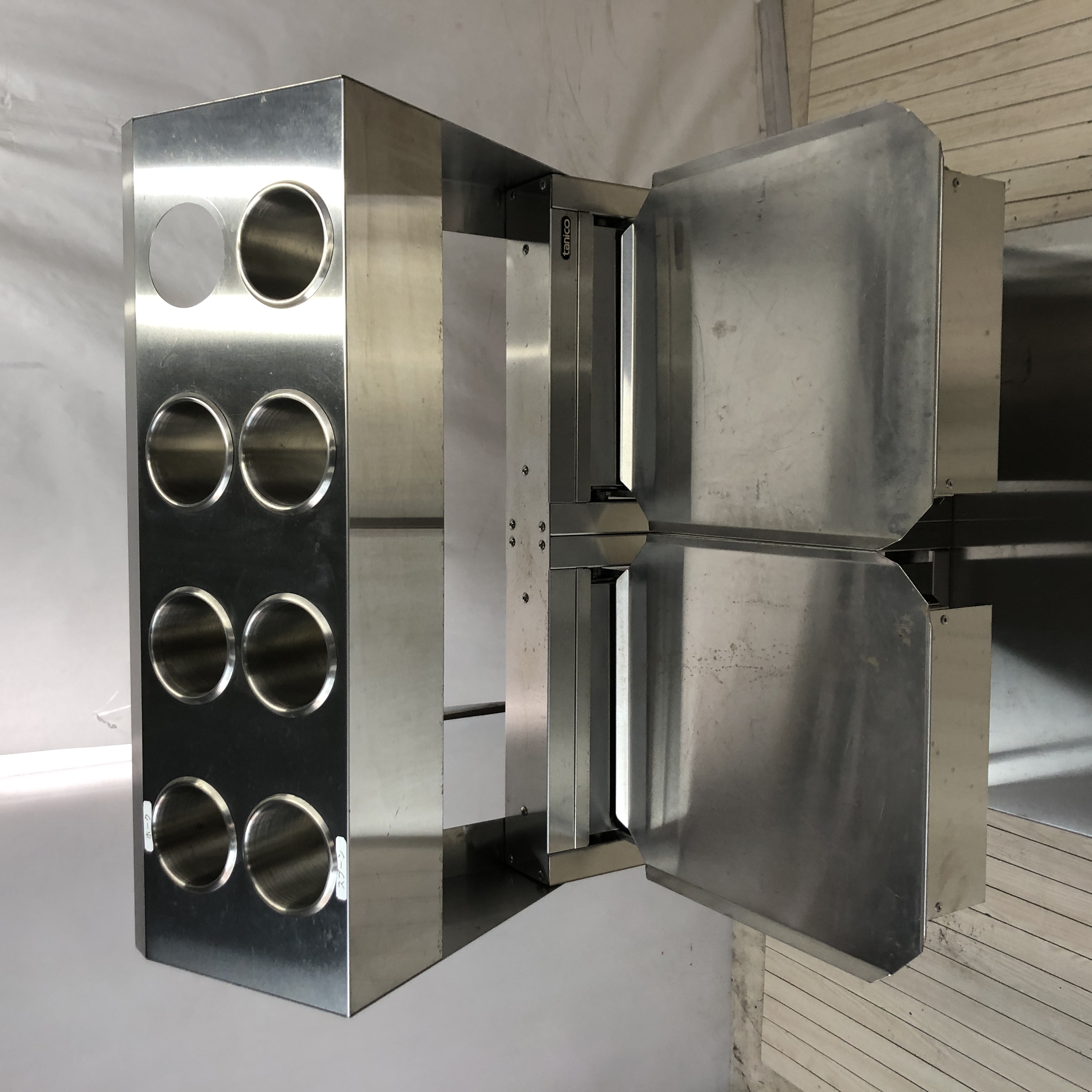 | 全体的に傷、汚れ、錆があります。 バネ部分全体的に錆があります。 上部にシールが貼られています。 食器ディスペンサーのシルバーシリンダー1点欠品しています。 | ||||||||||||||||||||