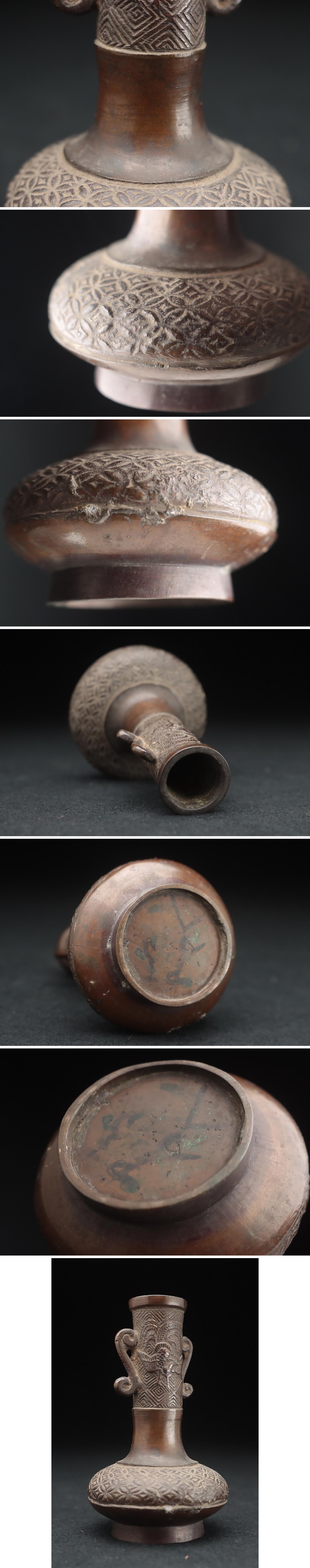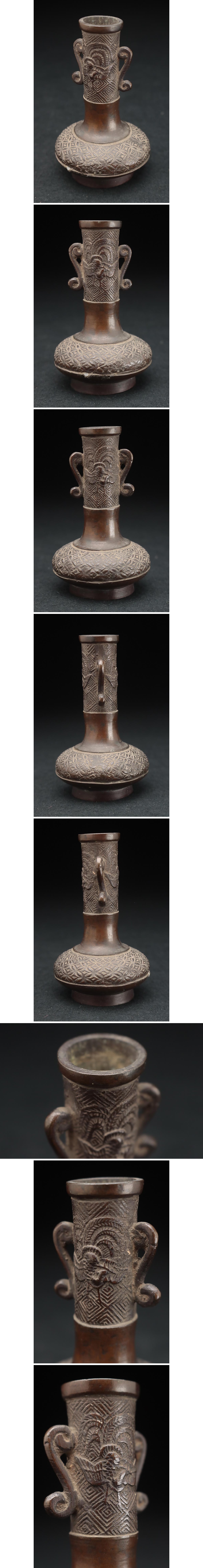 | ◆ 時代 古銅 鳳凰七宝繋紋 長頚小瓶 高10.5cm・銅双耳小花瓶・香瓶・花入・一輪挿し 金工古美術品 ◆