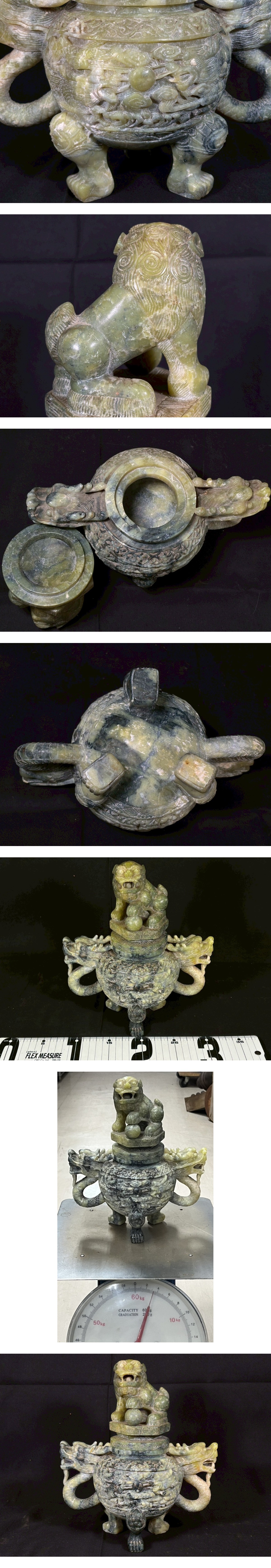 ●超絶技巧 中国美術 砡 獅子龍彫 蓋付三足香炉 高約26.5cm 獅子口中動玉 足下回転玉 緻密細工 唐物 骨董 翡翠調 飾壷 時代物 蔵出し ■サイズ:横幅 23cm/縦幅 14cm/高さ 26.5cm ■重量: 3.3kg ※素人寸法の為、若干の誤差はご了承ください。 ■状態につきましては経年に伴うスレ・汚れ・小キズ などが見られます。 ※その他の細かな状態は写真にてご確認・ご了承の上 ご入札くださいませ。 ●こちらの商品などは時代物や古いお品・骨董品となり ますので、細かな状態を気にされる方・神経質な方の ご入札はご遠慮くださいませ。【ZSG】 |