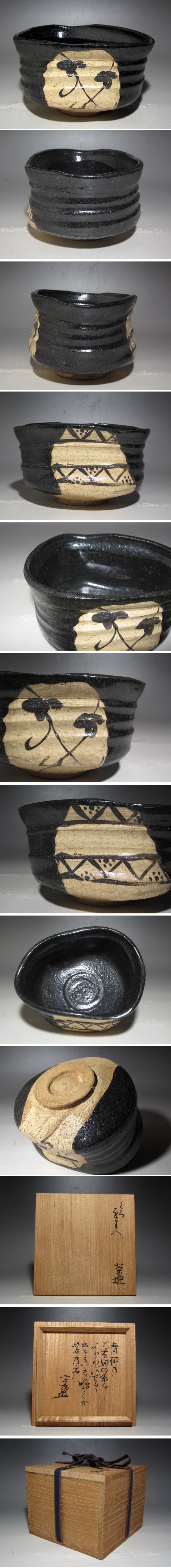 時代ある黒織部茶碗です。 趣ある景色の、時代を感じられる見事なお品です。 箱蓋裏に遠州流十二代宗慶の詩銘がある名品です。 サイズ 直径15cm/高さ9cm(多少の誤差はお許しください) 状態 一見して疵やヒビ・直しは見られません。 骨董品という事をご勘案頂き、時代経過のスレや、小さな傷がある場合があるかもしれませんのでご承知置きください。 | |||