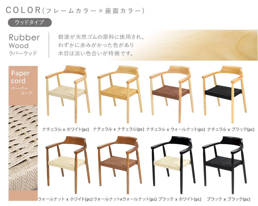 ●「フレーム(シート)」のお好きなカラーをご購入手続きの際【ご要望欄】へご記載ください。 【在庫状況】※完売となったカラーはご購入できませんのでご了承ください。 ナチュラル(ホワイトpc)--------------販売中。 ナチュラル(ナチュラルpc)------------販売中。 ナチュラル(ウォールナットpc)-------販売中。 ナチュラル(ブラックpc)---------------販売中。 ウォールナット(ホワイトpc)----------販売中。 ウォールナット(ウォールナットpc)---販売中。 ブラック(ホワイトpc)-----------------販売中。 ブラック(ブラックpc)-----------------販売中。 ![]() ●ペーパーコードのシートカラー、3種のフレームカラー全8パターンの中からお選びいただけます。 ●背もたれと肘掛けはひと繋ぎにデザインされ、身体を優しく包み込むようなフィット感のある座り心地です。 ●背もたれは職人の熟練の技により、弧を描くように美しく曲げられています。 ●贅沢に使用された天然木の美しい木目や滑らかな触り心地から、高級感と木の温かみを感じることが出来ます。 ●広く設定された座面は大人が座ってもゆったりしていて、快適な座り心地です。 ●均等荷重は約200kgとしっかりしています。 ●完成品なので、届いてすぐに使用できます。 ■重量: シート:ペーパーコード/約5.6kg ■耐荷重: シート:ペーパーコード/約200kg ■材質: 〈共通〉ラバーウッド[無垢材](本体)、フェルト(脚裏) 〈張り地〉ペーパーコード/ペーパーコード ●新品商品ではありますが、輸入商品の為、多少の擦り傷などがある場合がございますので、ご納得の上ご購入下さいませ。 ●ご購入後、お客様ご都合によるご返品、ご返金等は一切お受け致しておりません。 ●本商品を使用した際に発生したトラブル、事故につきまして、当社は一切の責任を負いません。ご使用に関しましては、全て自己責任にてお願い致します。 |