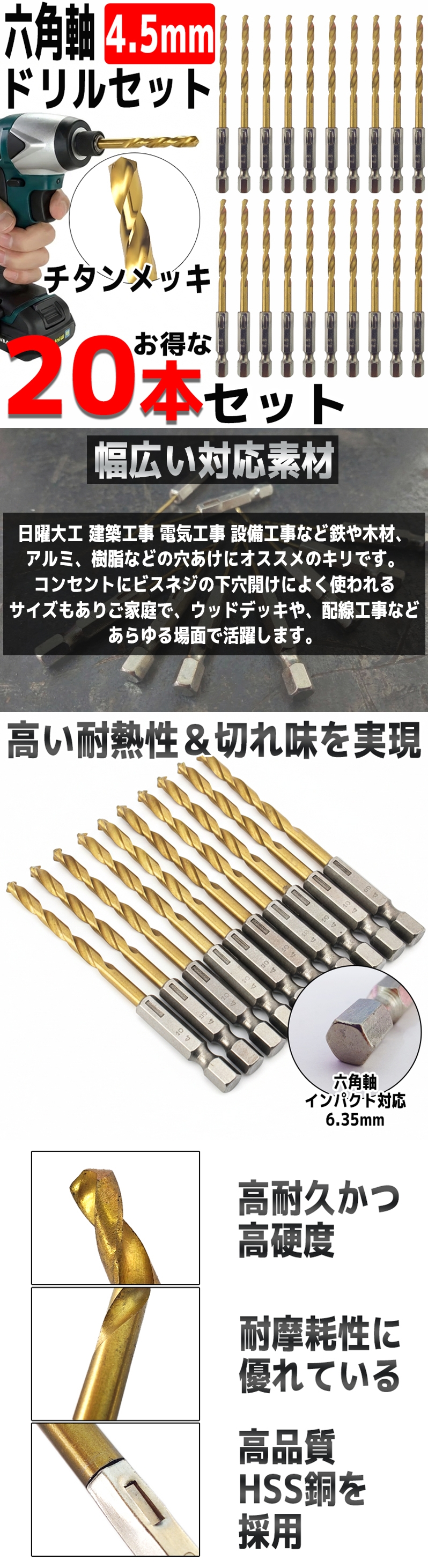 ![]() ■お得なドリルビット20本セットです。 高速度鋼(HSS)をベースに、排熱性と硬度を向上させる 銅チタン(Ti-Cu)コーティングを施したドリルビットセットです。 インパクトドライバーへの即時着脱が可能な6.35mm六角軸を採用し、 木材、プラスチック、アルミ、鉄、ステンレスなど穿孔における作業効率を最大化します。 チタンコーティングの表面処理で、高速度鋼が耐摩耗性の欠点を補って耐摩耗性を強化! 耐摩耗性、耐熱性に優れており抜群の切れ味、耐久性を持っています。 通常の鉄工用ドリル(ハイス鋼)と比較して、約3倍から10倍以上の寿命を持ちます。 安価な炭素鋼ビットとは異なり、高温下でも硬度が低下しにくいHSSを採用。 連続的な穿孔作業においても精度を維持します。 商品詳細 商品内容:4.5mm六角軸ドリル 20本セット 材質:HSS銅(チタンメッキ) |