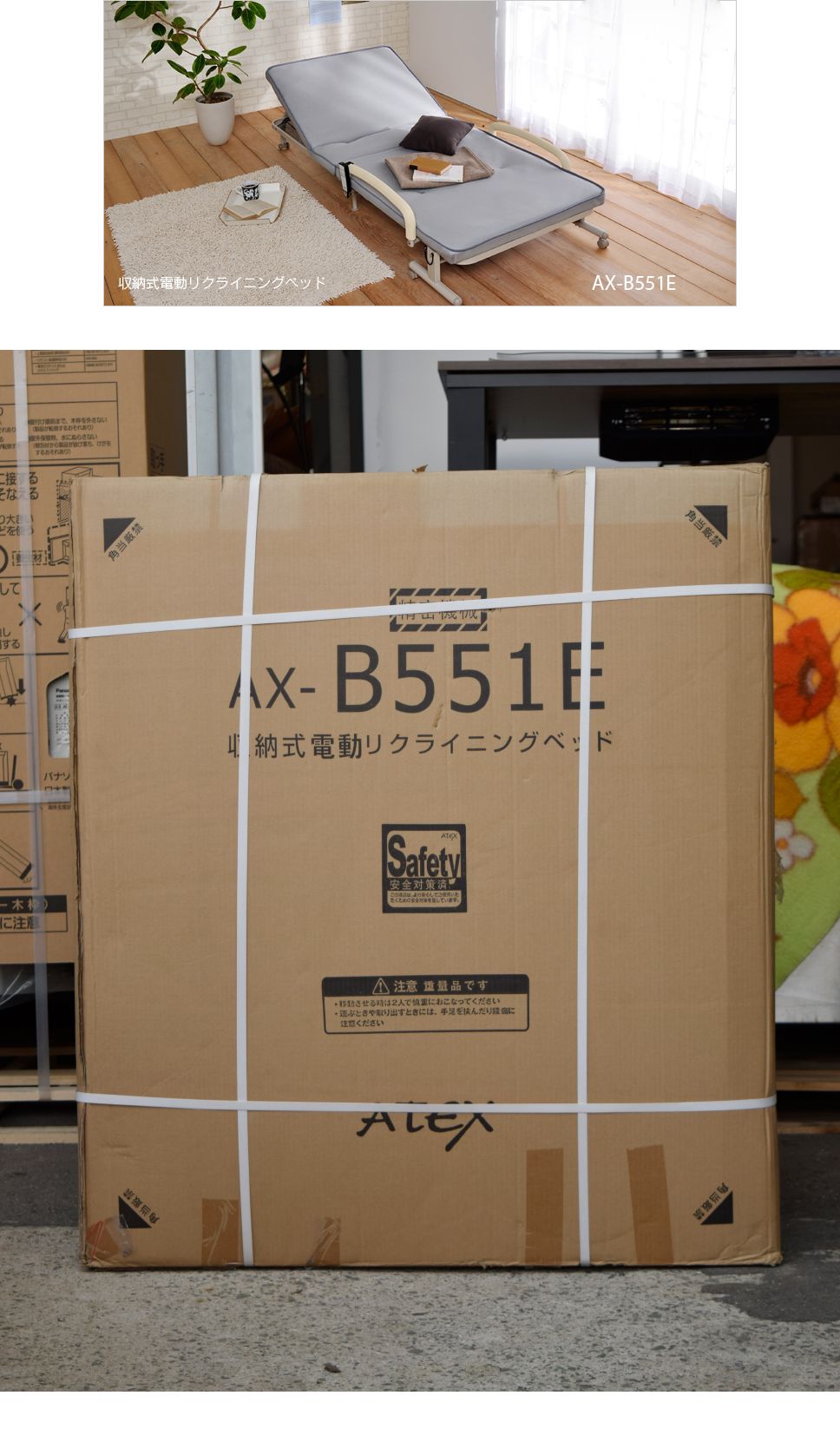| ■詳細 状態は若干箱に痛みがございますが、新品未使用品です。折りたたんで収納のできる電動リクライニングベッドです。個人様宛の場合は佐川急便220サイズにて発送いたします。 ■特徴 ・背もたれは70cmのゆったりハイバック、手元コントローラーで最大70度まで無段階にリクライニング。 ・シンプルで圧迫感のないロータイプベッドは、部屋を広く見せ、ベンチ感覚でお使いいただけます。 ・寝ている間に布団がずれるのを防ぎ、折りたたむときの支えにもなるグリップ ・マット表面生地には肌触りが良く、通気性に優れたダブルメッシュ生地を採用 ・収納時には長さ約47cmに。布団を引いたまま折りたため、キャスター付で移動もスムーズです ■仕様 本体:鋼(ウレタン樹脂塗装)、PP、PE、PU マット生地:ポリエステル(Wメッシュ) マット内部:硬綿、チップウレタン、ポリエステル綿、鋼 定格電源:100V 50/60Hz 定格消費電力:55W キャスター:ストッパー付 安全使用荷重:90kg以下 サイズ: ・収納時 W910 x D470 x H1,045mm ・マット W850 x D1,900 x H70mm ・マット面高さ 300mm ・背もたれ長さ 700mm ・電源コード 3.1m ・コントローラーコード:1.3m 重量:27.5kg |