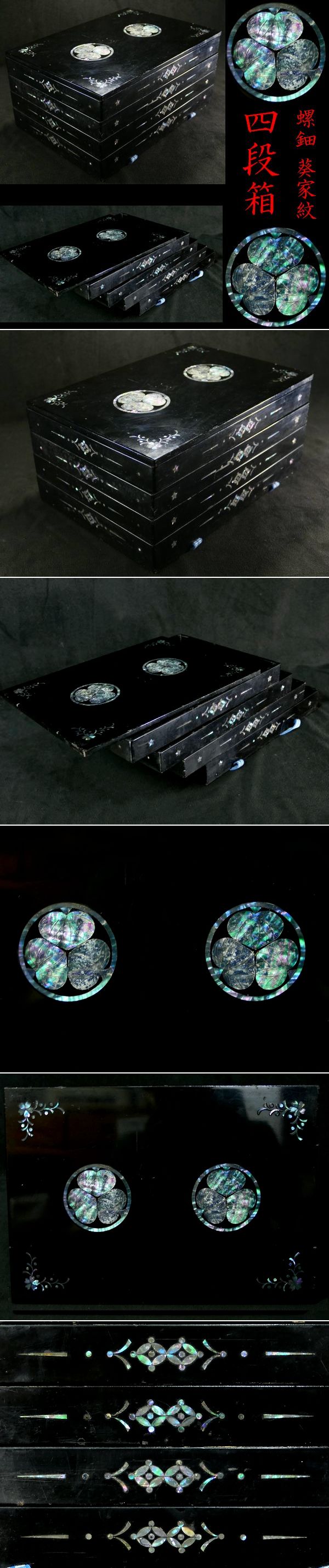 | 商品説明 | ~寸法~ 約 32cm× 約 22.5cm× 約 15.5cm 黒漆塗りに煌びやかな螺鈿細工が美しい 葵家紋入りの段箱です。 鍔など刀装具や小物の収納にいかがでしょうか。 お好きな方、この機会に是非手に入れて下さい。 大切にして頂ける方の元へ届けば幸いでございます。 ~状態~ 状態は画像の通りとなります。 経年による汚れや小キズ、漆表面のヒビ等ございます。 詳しくは画像にてご確認下さい。 許容範囲内の時代傷みはご理解下さい。 |