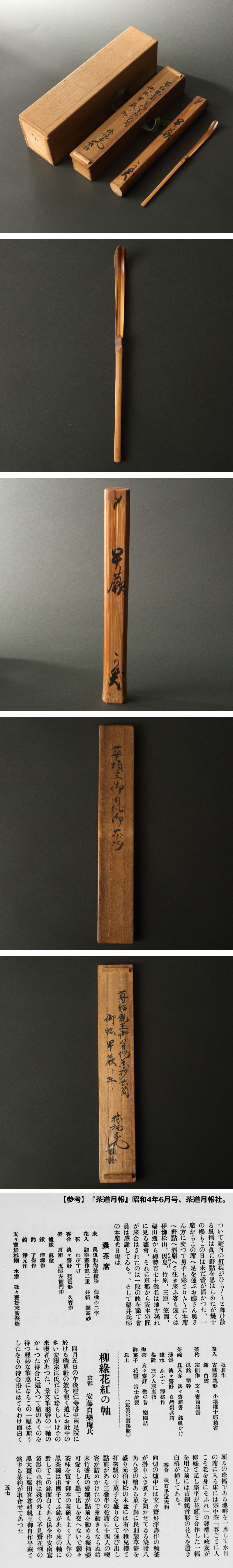 知恩院宮尊超法親王の竹茶杓です。 有栖川流の達筆で、「早蕨」の銘が附せられたシミ竹の茶杓です。 尊超法親王は有栖川宮家出身、浄土宗総本山の名目上の長であり、徳川家の猶子として朝幕関係の一端をになう知恩院宮として生涯を過ごしました。妹宮に吉子女王(徳川斉昭正室)が存し、斉昭とは国学・和歌を通じ交流があったことで知られます。 本作には江戸後期~明治期の茶人・明田宗光の書付箱が付属しますが、明田は浄土宗の書籍を扱う書林「明田嘉七」の当主であり、その誼で拝領されたものと推察されます。その後昭和4(1929)年の『茶道月報』では女流茶人・安藤自楽庵の茶事で用いられた記述が見え、京都の錚々たる裏流茶人の手を渡ったことが知られます。 梁川星巖や藤田東湖といった志士たちの敬慕を受けた、幕末史の知られざるキーパーソンの見事な逸品です。 ◆知恩院宮尊超法親王 江戸後期,有栖川宮織仁親王の王子。文化2(1895)年知恩院門室を相続。光格天皇の養子,11代将軍徳川家斉の猶子となる。同7(1810)年親王をゆるされ,得度した。嘉永5(1852)年薨、51歳。幼称は種宮。俗名は福道。著作に「吹上庭記」「山里一覧記」。 ◆明田宗光 江戸後期~明治期の茶人。本名は嘉七。京都・寺町蛸薬師の書籍商。浄土宗系の仏教書や謡本を取り扱う。裏千家西村宗通、のち玄々斎の直門。前田瑞雪・西村宗元とともに京都の裏流三羽烏として知られた。号は妙中斎・猿栖。 ◆安藤自楽庵 戦前期の茶人。号は宗江。大正2(1913)年円能斎の「茶道夏期講習会」に参加した女流茶人の草分けであり、瑞草会や自楽会などの社中を組織。奥谷秋石・水野竹次郎を門人とした。 付属:共筒・識箱・二重箱が付属します。 寸法:長さ17.5cm(最大幅。若干の誤差はご了承下さい) 状態:経年感、使用感、下部にキズがございます。 |