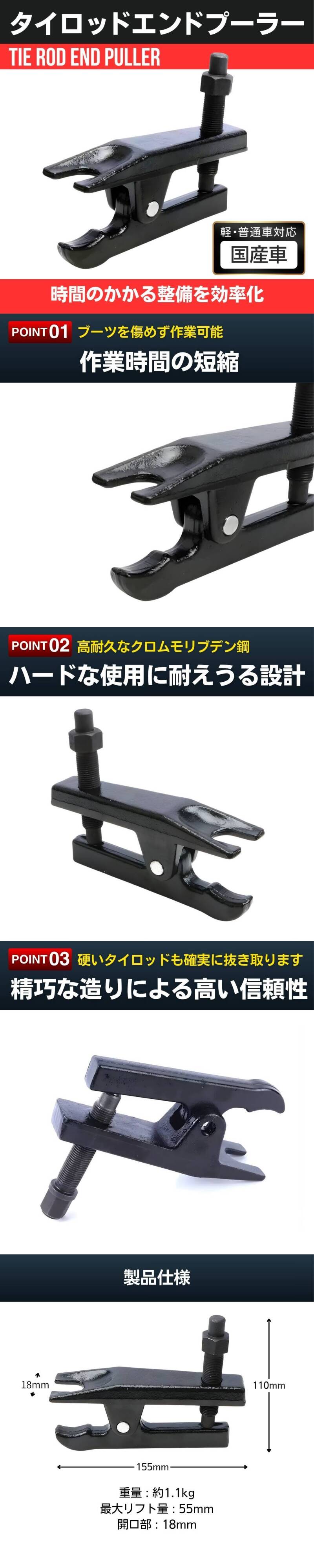 ●商品説明 「固着して外れない…」そんな足回り整備のストレスを劇的に解消します! 本製品は国産車のタイロッドエンド形状に合わせた専用設計。 軽自動車から普通車まで、ほぼ全ての車種でスムーズな脱着を可能にします。 作業時間を大幅に短縮できるだけでなく、大切なブーツを傷つけるリスクも最小限に抑えます。 24時間以内のスピード発送でお届けしますので、お急ぎの整備にも安心してお選びいただけます。 ●機能(特徴) 高耐久素材: 非常に強度の高いクロムモリブデン鋼を採用し、長寿命を実現。 防錆加工: 錆びに強く、プロの現場からDIYまで長く愛用いただけます。 専用設計: 国産車の形状に最適化されており、汎用品より確実な作業が可能。 安全構造: タイロッドエンドやボールジョイントを傷めにくい設計。 ●使い方/取り付け方 タイロッドエンドとアームの隙間に、本ツールの先端(爪)をしっかり差し込みます。 21mmのレンチを使用し、プーラーのボルトをゆっくりねじ込みます。 適度にテンションがかかった状態で、ボルト頭をハンマーで軽く叩くと分離します。 足回りの分解整備や、破れたブーツの交換作業に最適です。 ●商品詳細 サイズ: 全長 約155mm 重量: 約1.1kg 爪幅: 約18mm 素材: クロムモリブデン鋼 ※作業には別途21mmのレンチが必要です。 |