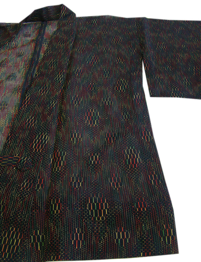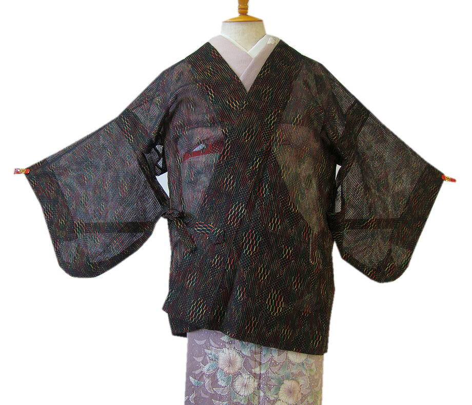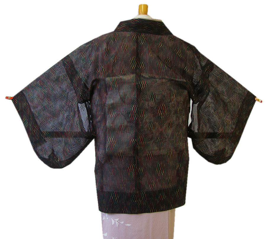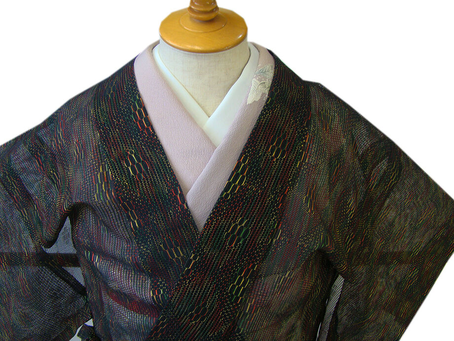 | 商品説明 | とてもしなやかなさらりとした手触りの涼やかな「羅」の生地の道中着。 黒色地に緑、赤、黄色等のモザイク柄。 |