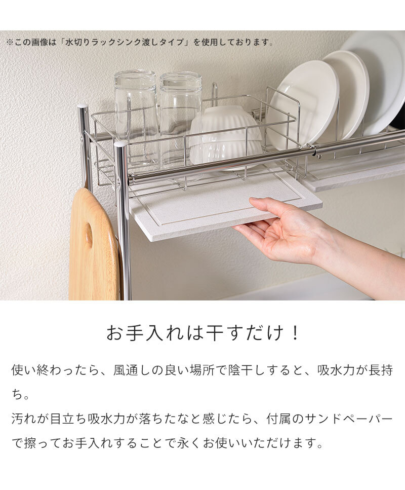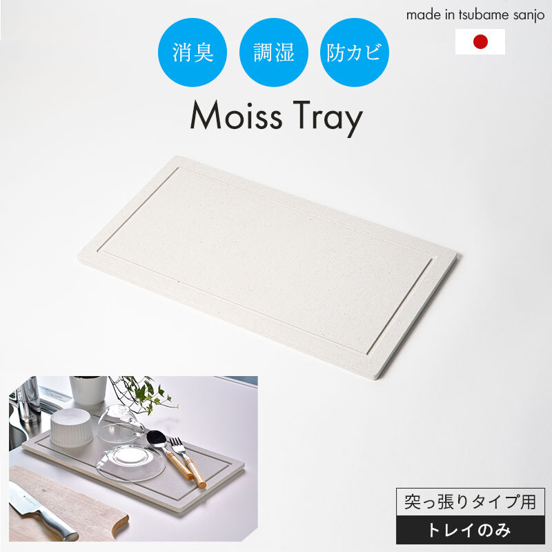 | KAWAKIシリーズの水切りラック 突っ張りタイプ専用の交換モイストレイですが、トレイ単品だけでも使用できます。 シンク横などに置いて洗った物をのせるだけで乾かせます。 洗い物から落ちた水滴を吸収し、徐々に空気中に放出してくれる日本製の吸収トレイ。 水捨ての手間や、水垢の心配もなくお手入れ簡単です。 吸水力が弱ったと感じたら、風通しの良い場所で陰干しをしてください、汚れがついた場合は付属の紙ヤスリでこすってください。 置いた場所を傷つけないように貼付け式のクッションが付いてます。 【モイスとは】 吸水素材モイスは、天然素材を主成分とするインテリア建材です。 バーミキュライトや珪砂を主成分とした、天然鉱物から作られる日本製の建材です。 珪藻土同様、水分を吸収し吐き出す性質から、近年バスマットや水切りプレートとしても人気の素材です。 吸水が早く、表面の手触りがサラっとしているのも特徴です。 |