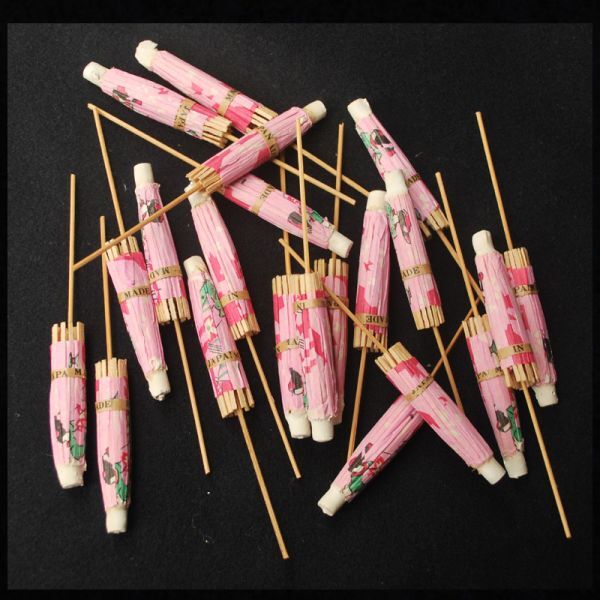 1950~60年代のぐらいの海外向け輸出品だと思われます。 外人向けの日本のイメージシンボルをあしらった図柄が描かれ、 粗末な材料にも関わらず、 細かな手間をかけた内職仕事 ( 、・・・だと思われます。) で、 作られたと思われるチープなカクテルパラソル。 どれも、「MADE IN JAPAN」の帯付です。 ◆ サイズ ◆ ( 最大部分 ) w : 9 . 4 ( 図部分 : 8 . 3 ) × 長さ : 10 cm 程 ◆ 状態 ◆ 折れや破れなど傷みの無い物を送りますが、 元来消耗品に付、一度開くと多少なりともダメ―ジがあると思われます。 その為、一品づつの点検は行っておりません。 悪しからず御了解の上で、御注文頂ければ幸いです。 又、画像は在庫中の見本画像です。 一品づつの手作り品に付、実物とは多少異なります。 |