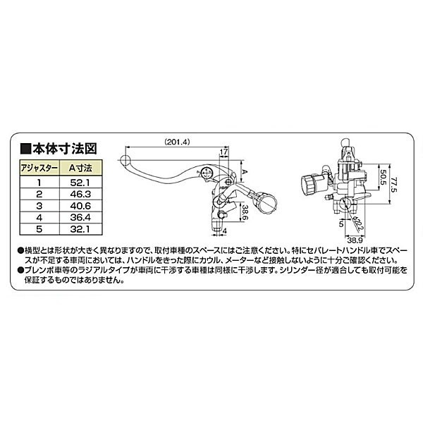 | ●ピストンを縦型にすることでレバーレシオを大きくとり油圧レシオを小さく設定することで入力ロスの低減を図りクラッチのコントロール性を向上! ●レバーアジャストは5段階調整可能 ●安心のブレーキスイッチ、リザーバータンク、アルミタンクステー付 ■仕様 鋳造ボディ 本体色:ブラック レバー:ブラック ピストン径φ19(3/4インチ ※横型14mm相当) ※φ19は横型マスター14mmインチと互換性があります。他サイズへの使用は不可。 φ22.2ハンドル用 ※ご購入前に、必ずメーカーサイトにて適合情報・注意事項をご確認ください。 https://www.daytona.co.jp/products/single-78402-genre ※バンジョーボルト(M10×P1.25)は別売りです。 ※シリコン系DOT5(BF5)ブレーキフルードは使用しないでください。 ※スクーター等の左側ブレーキマスターシリンダーとしては使用できません。 ※取り寄せ品。 |