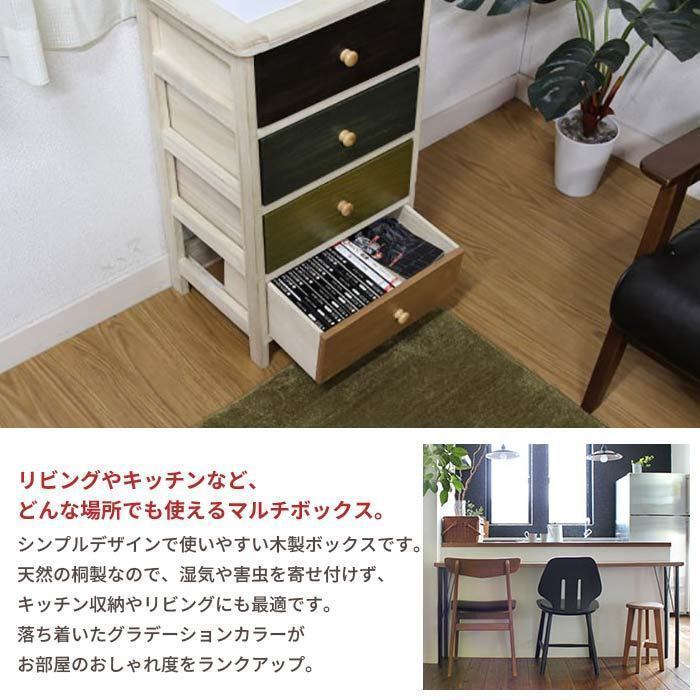 | 商品説明 | 落ち着いたグラデーションカラーがおしゃれな桐製ボックス。 桐製なので、湿気や害虫を寄せ付けず、キッチン収納やリビングにも最適。 天板はタイル付なので、熱いお鍋やケトルなどを置くこともできます。 取っ手は持ちやすく可愛らしい丸形。 見た目もかわいい脚付きタイプはチェストを動かさずに掃除ができるので楽ちん。 届いたらすぐに使える完成品。(取っ手のみ取り付けが必要となります。) 3段タイプの他に4段・5段、チェスト4段、ベンチがございます。 ※このページは4段タイプを販売しております。 【仕様】 ■商品サイズ:[全体]約幅400×奥行300×高さ670mm ■内寸:[引出]約315×245×115mm ■重量:約4.7kg ■素材・材質:天然木(桐)、タイル ■塗装:ラッカー塗装 ■耐荷重:約20kg ■機能・特徴:◇湿気や害虫に強い桐材使用 ◇天板タイル ■組立区分:完成品(取っ手のみ取付必要) ■キーワード:チェスト 4段 木製 完成品 脚付き ウッドチェスト 幅40cm カラフル グラデーション スリム 桐 収納家具 天板タイル キッチン リビング 収納 天然木 ナチュラル カントリー 北欧 おしゃれ リビングボード サイドボード 新生活 一人暮らし 【同シリーズ】 ※【同シリーズ】のリンクは当店の店のページへ進みます。 ● チェスト |