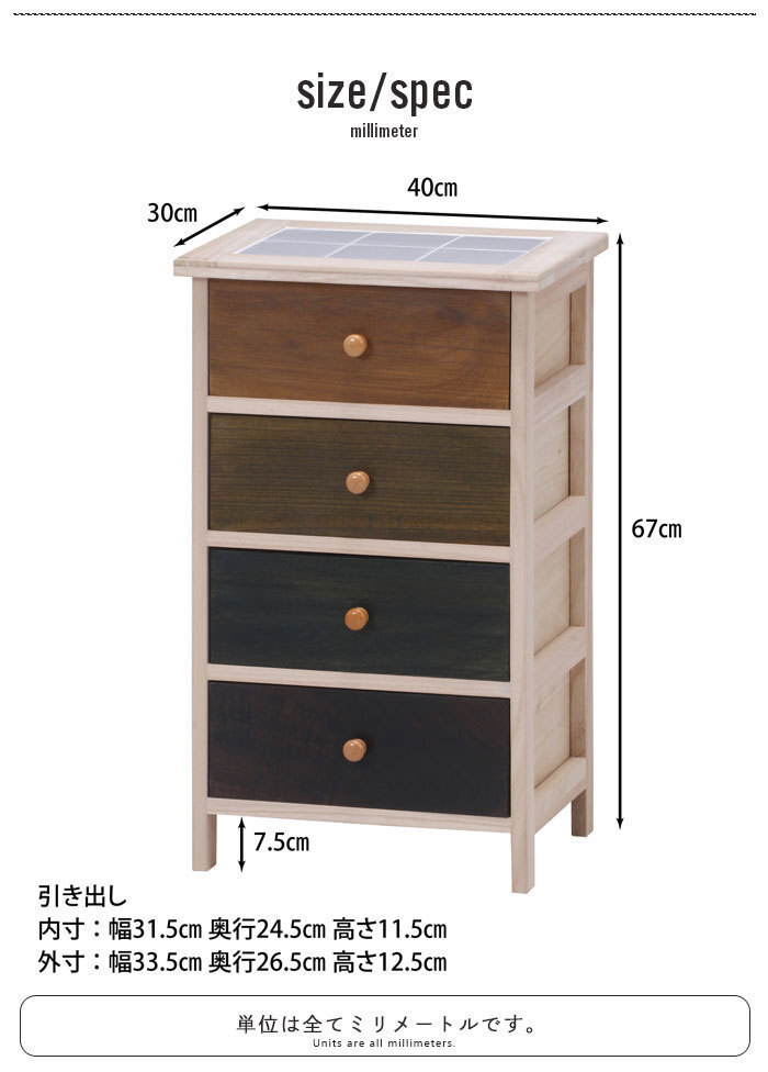 | 商品名 | チェスト 4段 木製 完成品 脚付き ウッドチェスト 幅40cm スリム 桐 収納 家具 天板タイル 天然木 サイドボード おしゃれ M5-MGKFGB00122 |
