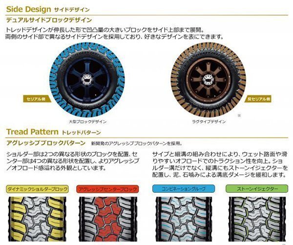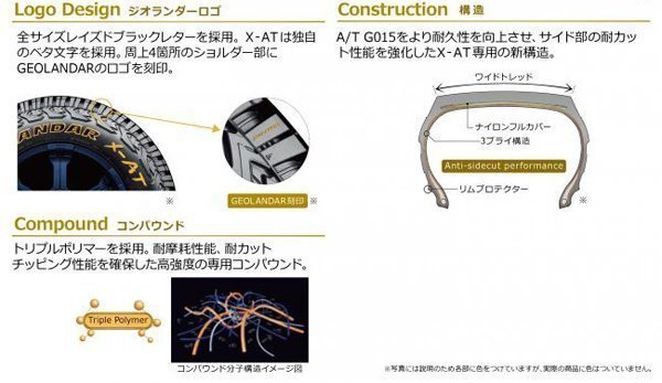 | タイヤ名 | YOKOHAMA GEOLANDAR X-AT G016 ※よりアグレッシブなデザインを求める“エクストリーマーのためのオールテレーンタイヤ”!! 安心の国産製になります。 |