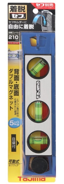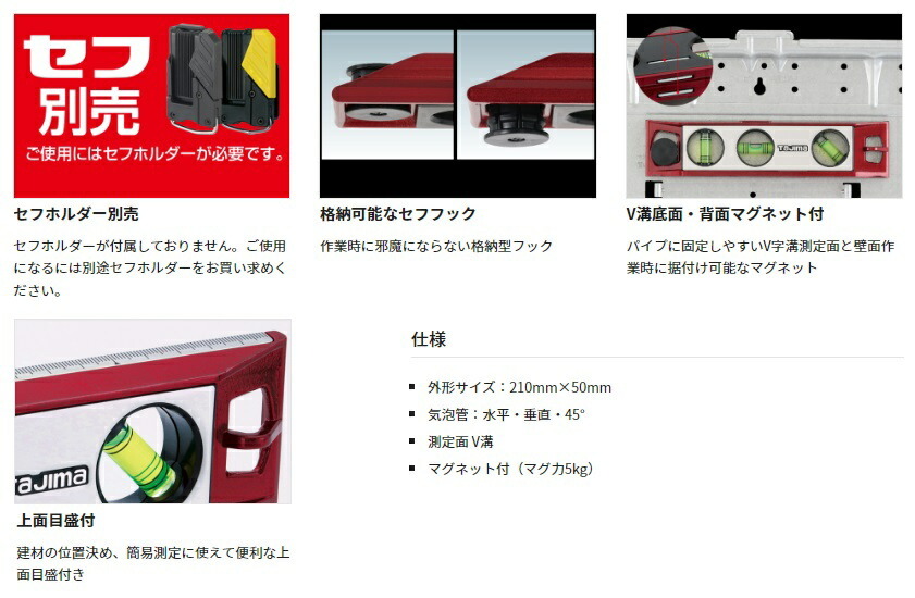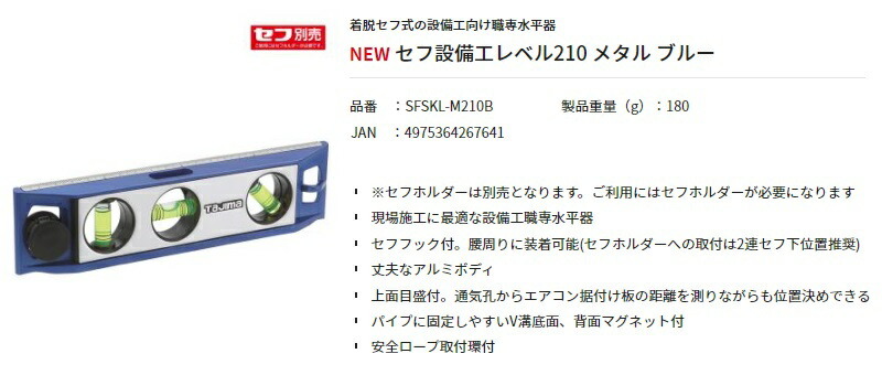 タジマ TAJIMAセフ設備工レベル210 メタル ブルー品番:SFSKL-M210B着脱セフ式の設備工向け職専水平器■製品情報・製品重量:180g■特長・※セフホルダーは別売となります。ご利用にはセフホルダーが必要になります・現場施工に最適な設備工職専水平器・セフフック付。腰周りに装着可能(セフホルダーへの取付は2連セフ下位置推奨)・丈夫なアルミボディ・上面目盛付。通気孔からエアコン据付け板の距離を測りながらも位置決めできる・パイプに固定しやすいV溝底面、背面マグネット付・安全ロープ取付環付■仕様・外形サイズ:210mm×50mm・気泡管:水平・垂直・45°・測定面V溝・マグネット付(マグ力5kg)