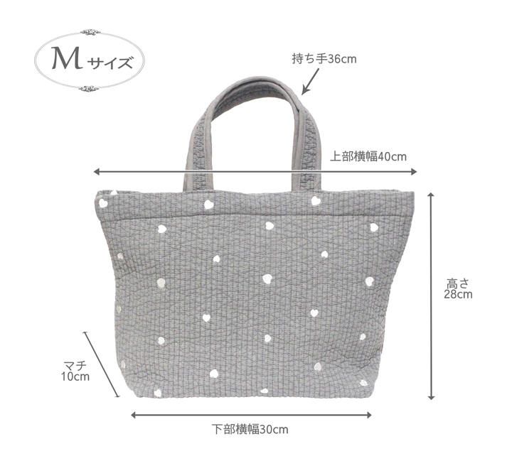 | サイズ | バッグ横:上部40cm下部30cm 高さ:28cm マチ:10cm 持ち手:36cm 内ポケット:約幅19x深さ12cm |