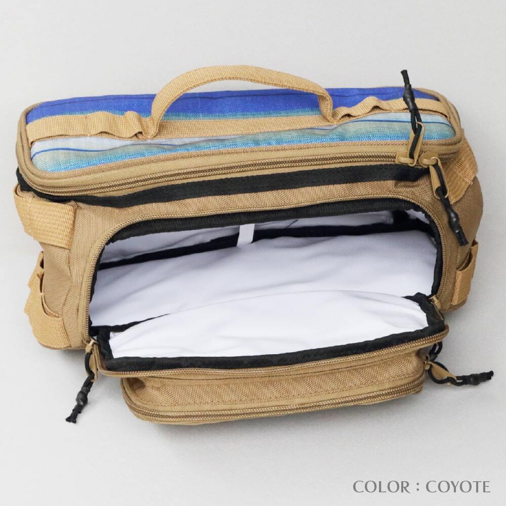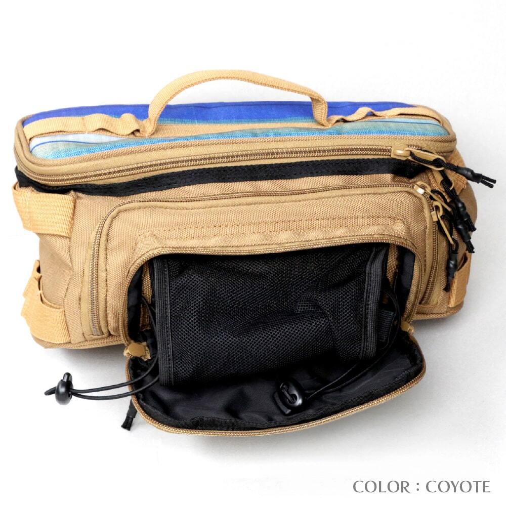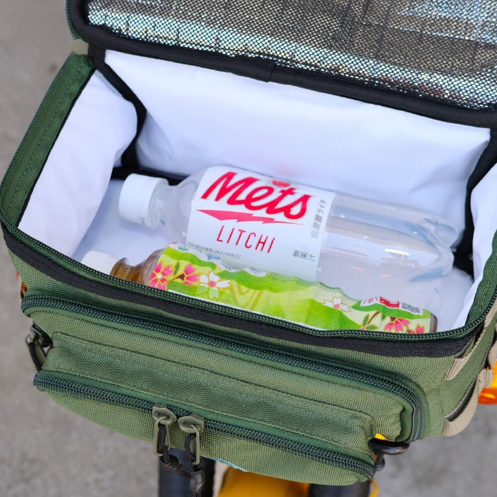| 車種汎用保冷バッグ。 メイン部分は保冷バッグとなっており、上からも側面からも出し入れができる仕様。 五面もマルチツールベルトがついており、車種への取り付け方はもちろん、キャンプ等のアウトドアシーンでも使い方次第で幅が広がるバッグ。 手前の小さなポケットには、ペットボトルを収納できるネット型ドリンクホルダーが付属。 *レインカバー付き |