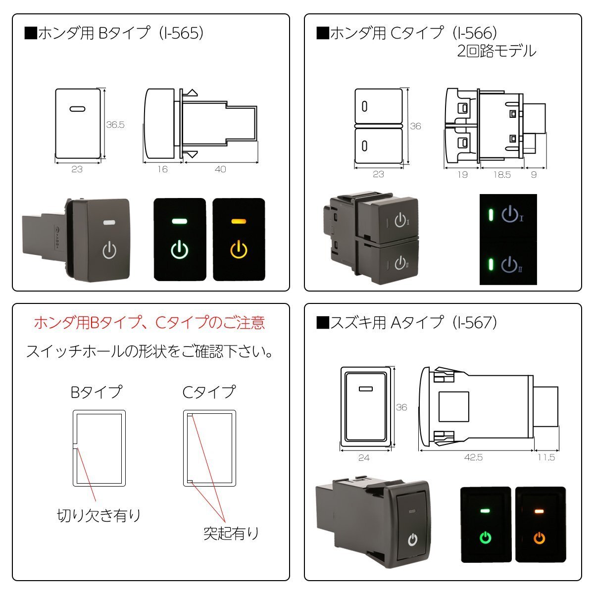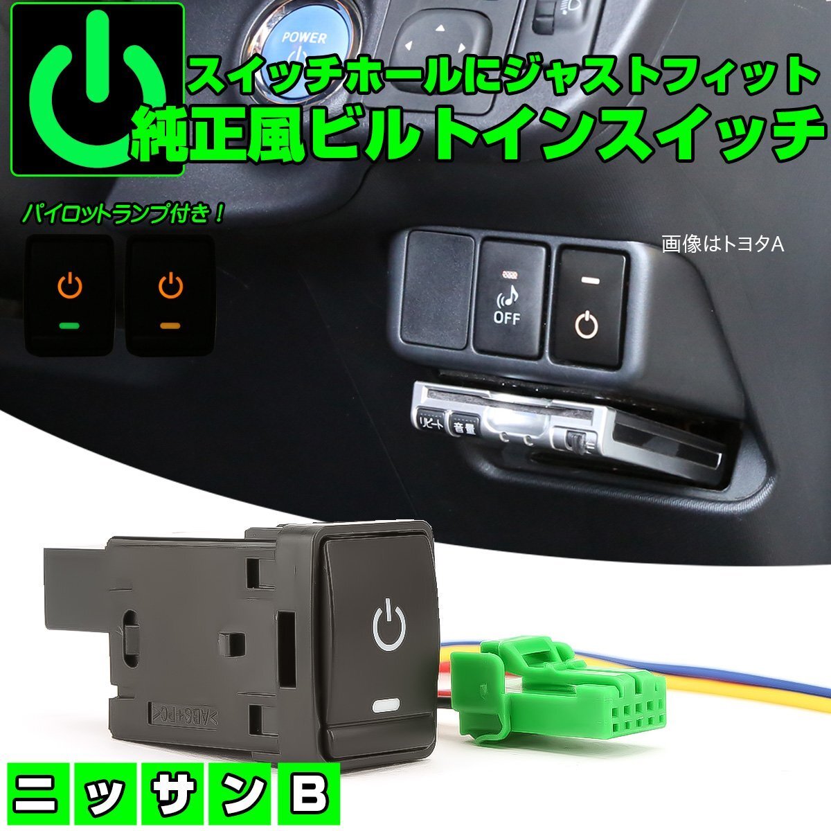 車内の使われていないスイッチホールにジャストフィットする純正風スイッチ。 各種電装品のON/OFF便利なプッシュ式。 後付け感がなくこだわり派の方も納得の仕上がり。 イルミネーション付きで夜間の視認性も良く、動作状態がひと目でわかるパイロットランプ付き。 簡単な配線図が付属いたします。 | ■純正形状スイッチ ■形状:ニッサンBタイプ ■入数:数量1で1個 ■スペック:DC12V専用 MAX0.5A ■ランプ発光色:グリーン ■配線図付き ※適合表記載の車種であってもグレード、オプションの有無によりスイッチホールに空きがなく取り付けが出来ない場合がございます。 ※記載車種は一例です。適合多数のため、取付可能かは製品サイズを目安にご判断下さい。 トヨタA トヨタB トヨタC ニッサンA ニッサンB ニッサンD ホンダA ホンダB ホンダC スズキA ミツビシA | |