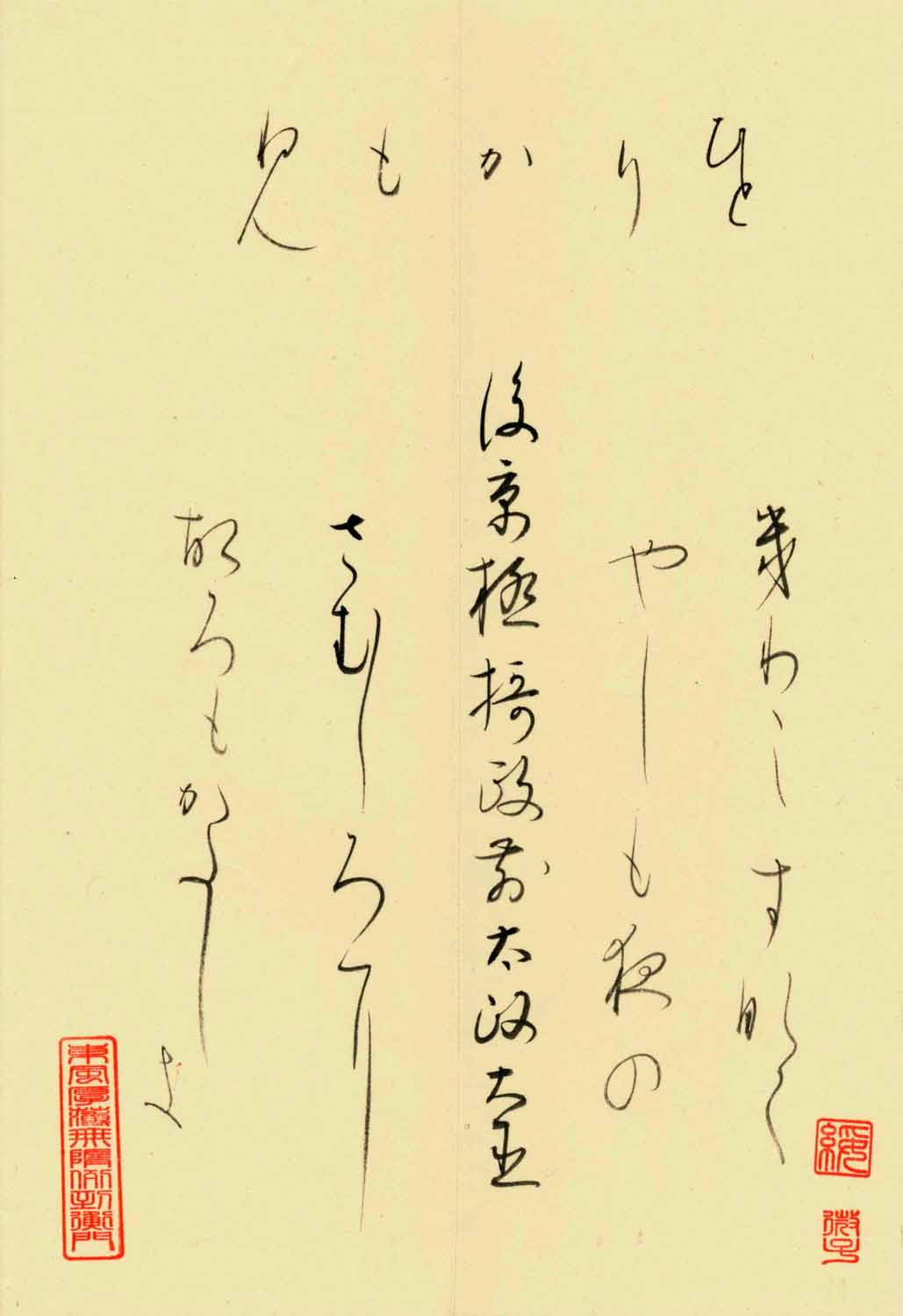 伊達徽子(のりこ)の和歌は「ちらし書」と呼ばれる書法です。文字を散らして布置するわが国独自の書き方です。この書法の歴史は平安時代の康保3年(967)の「紙背仮名消息」(滋賀・石山寺)、同じく平安時代の公卿・藤原公任(きんとう)自筆『北山抄』「仮名消息」(京都国立博物館)が知られております。各行に高低の変化をつけ、流暢(りゅうちょう)に続く連綿はきわめて美しいもので「百人一首」の書法として平安時代の公卿卿などの間で広まり、その後大名家の姫君の間で用いられておりました。
