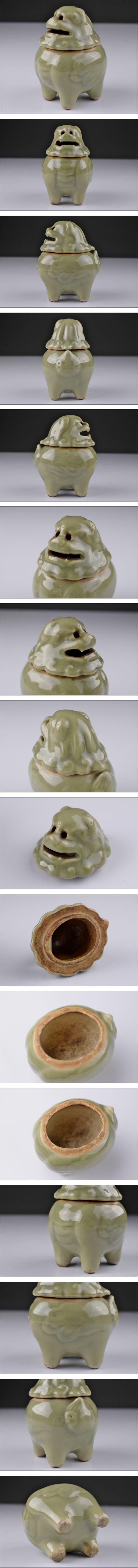 品 名:古美術品 時代 青磁 獅子 香炉 寸 法:高さ 8.8㎝ 幅 7.2㎝×6㎝ 総重量:171g 状 態:傷など無く良品でございます。 | |||